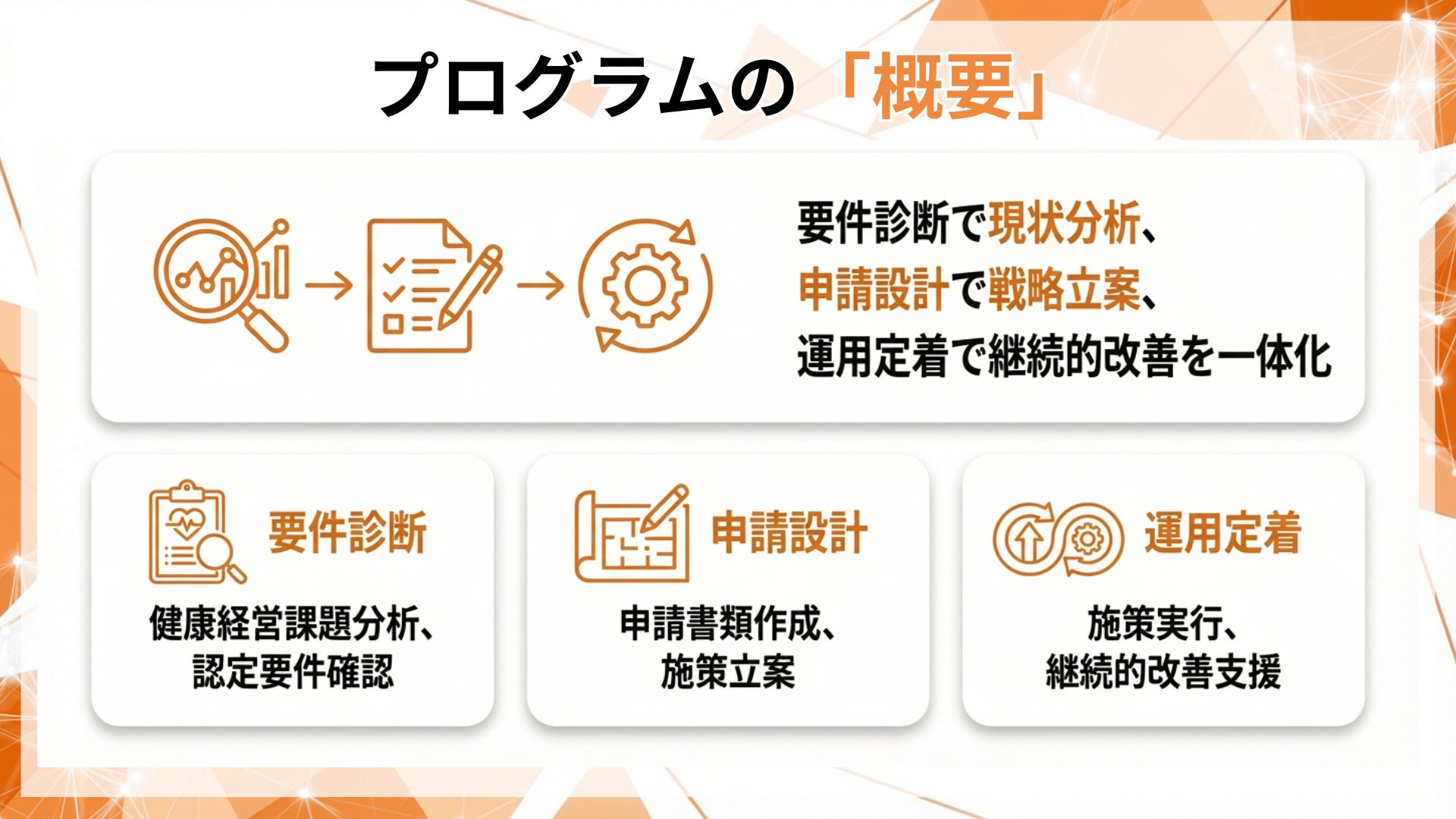 要件診断から申請設計・研修実装・運用定着まで一体支援、採用・定着・生産性に効く健康経営へ