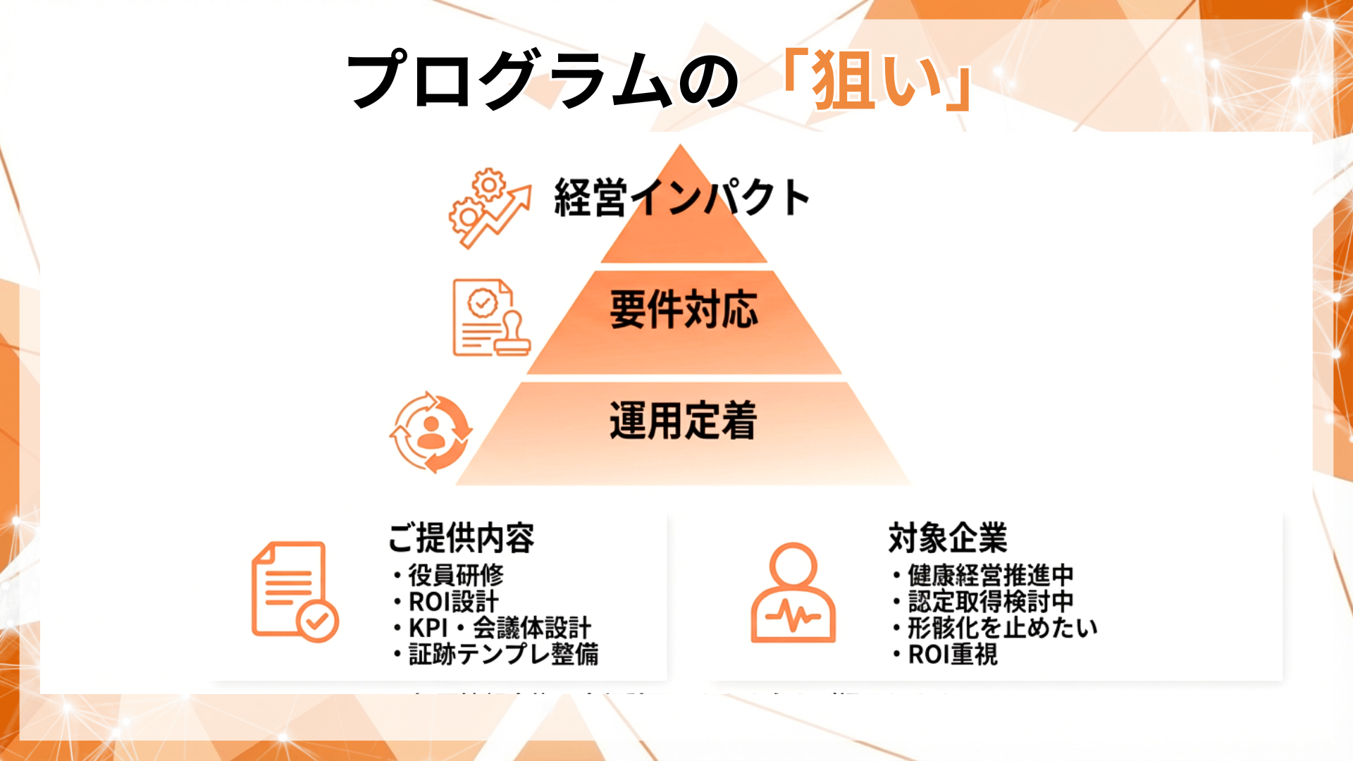 当社は、認定取得をゴールにせず、取得後に回る運用を前提とした要件診断・申請設計・実装・定着支援を一体提供することで、既存コストを見直しながらROIが出る健康経営の運用へ組み替えることを目的に、本サービスを開始しました。