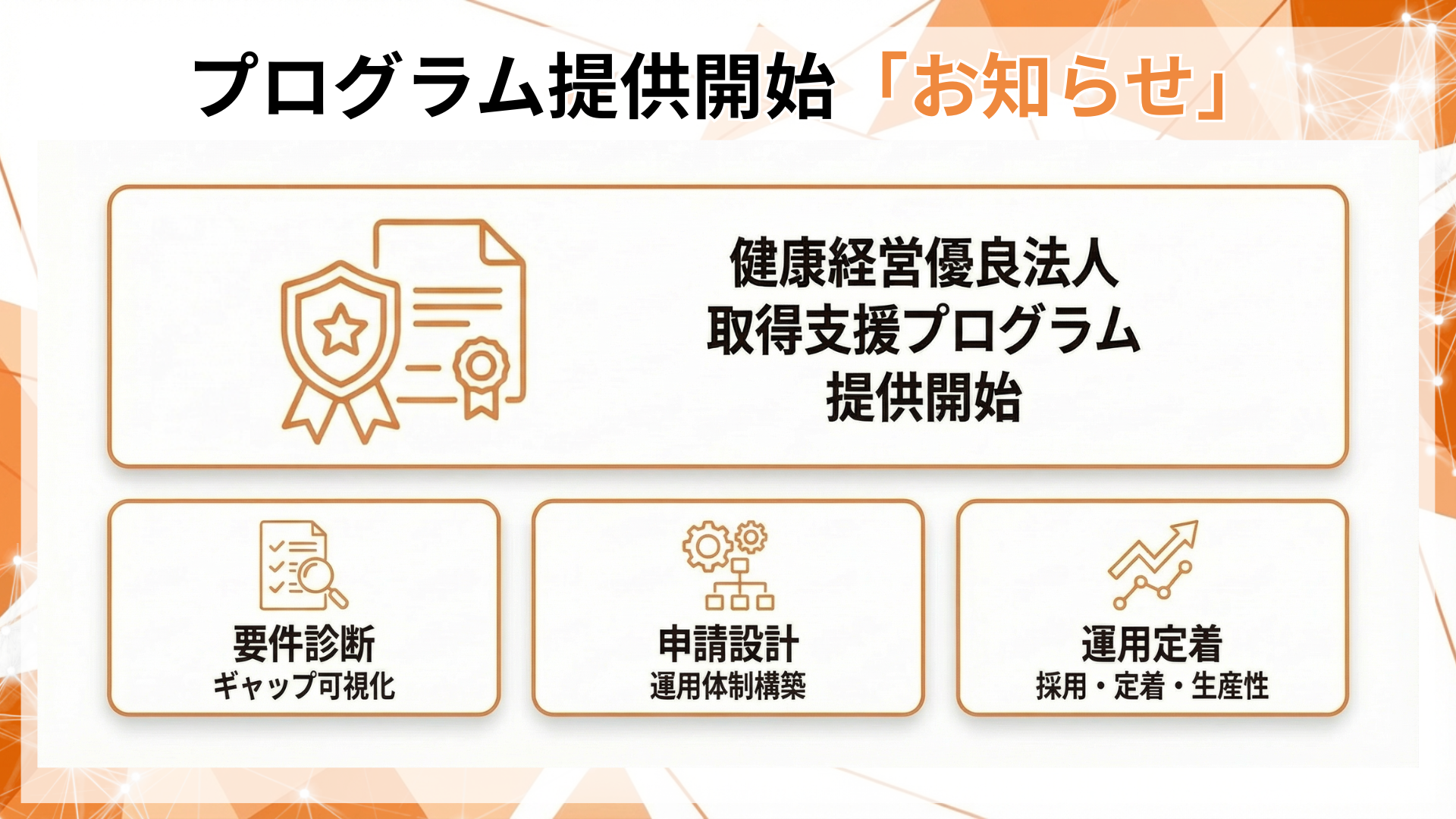 要件診断から申請設計・研修実装・運用定着まで一体支援、採用・定着・生産性に効く健康経営へ