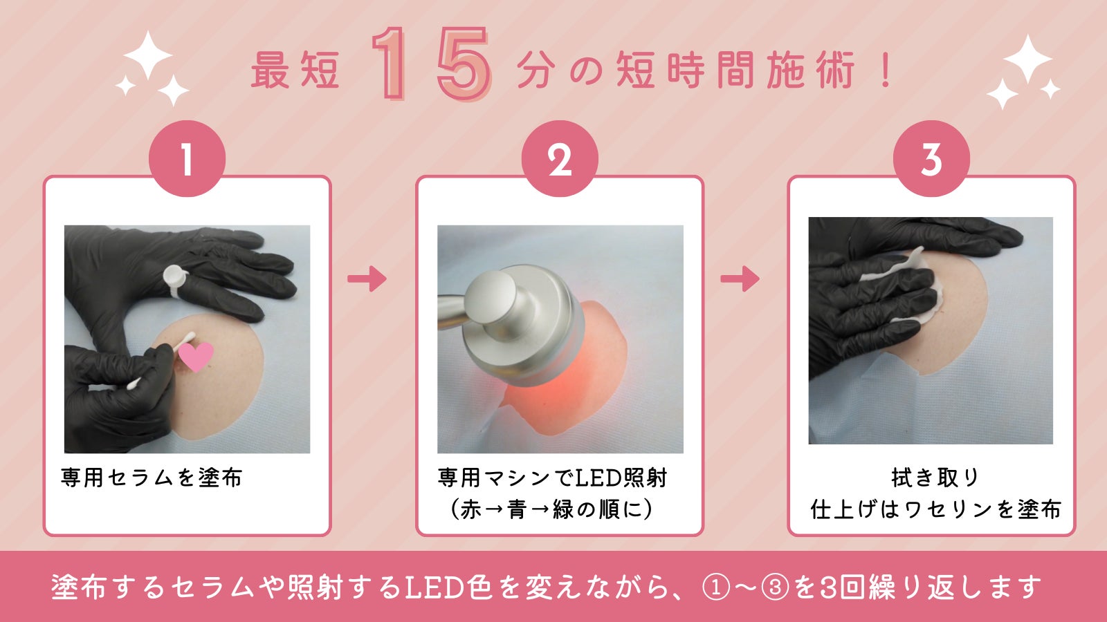 ローマピンクの施術は、専用セラムの塗布と専用機器を用いたトリートメントを組み合わせて行うシンプルな工程で構成されています。