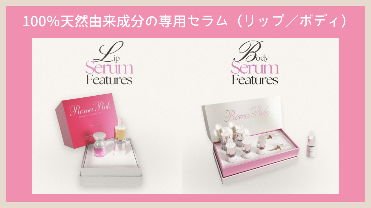 ローマピンクの施術は天然由来成分を中心とした専用セラムを用いて行われ、刺激や負担に配慮したトリートメント設計となっています。
