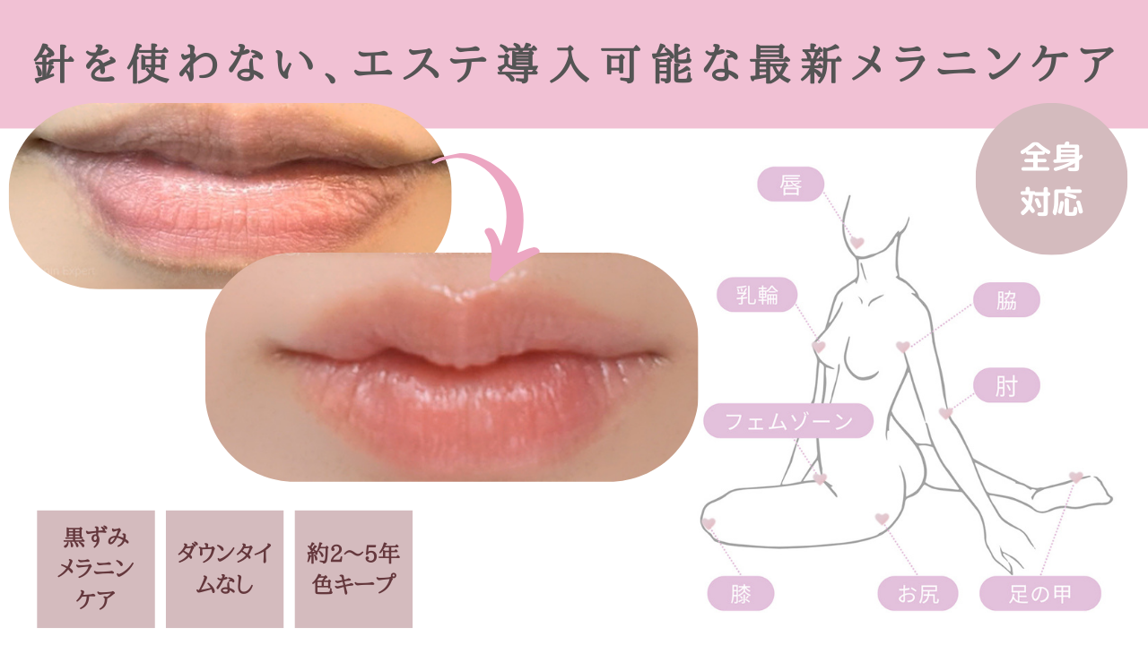 唇やバストトップ、デリケートゾーンなど、従来のエステではアプローチが難しかった部位にも対応できる点が特徴で、顧客満足度向上につながるメラニンケアとして活用されています。