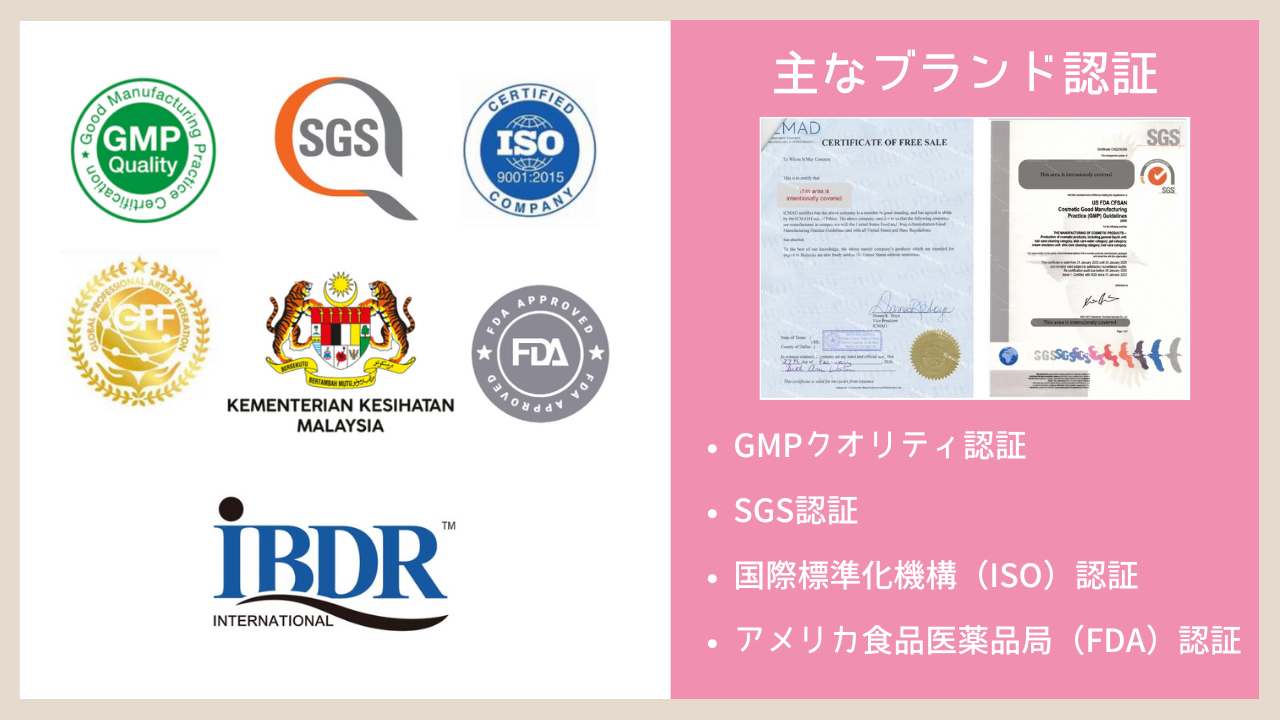 使用する専用セラムはGMPクオリティ認証、SGS認証、ISO規格、FDA基準など、各種品質管理・製造管理基準に基づき製造・管理されています。