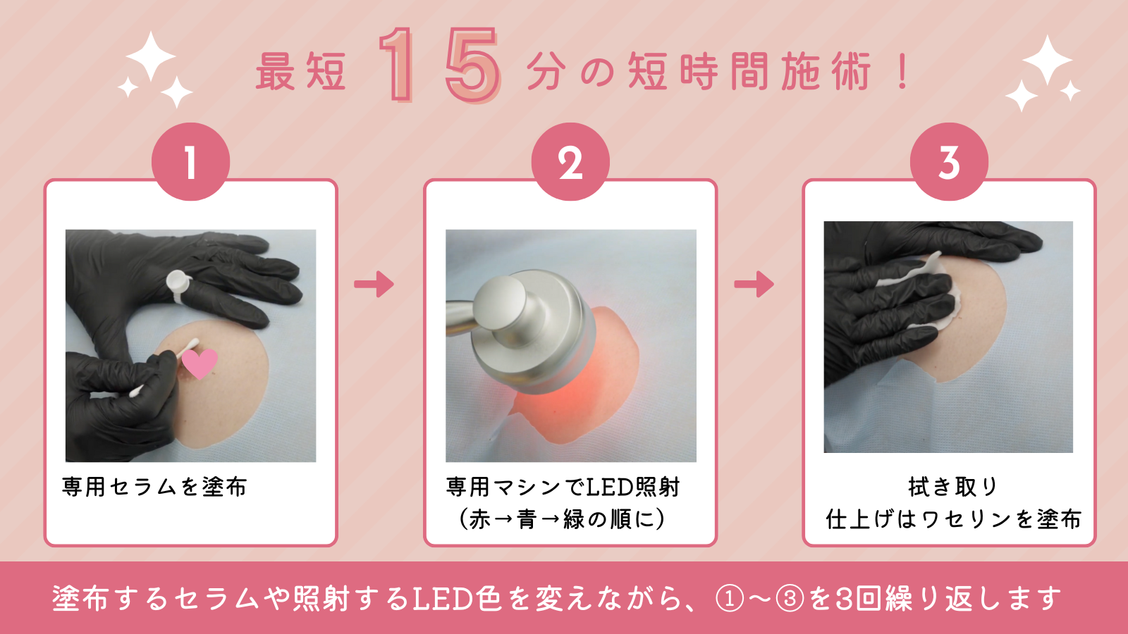 ローマピンクの施術は、専用セラムの塗布と専用機器を用いたトリートメントを組み合わせて行うシンプルな工程で構成されています。