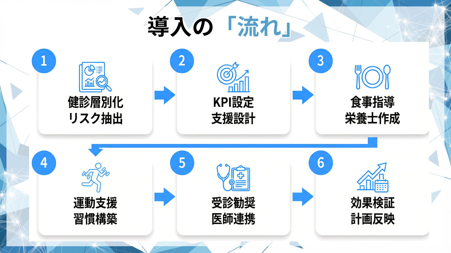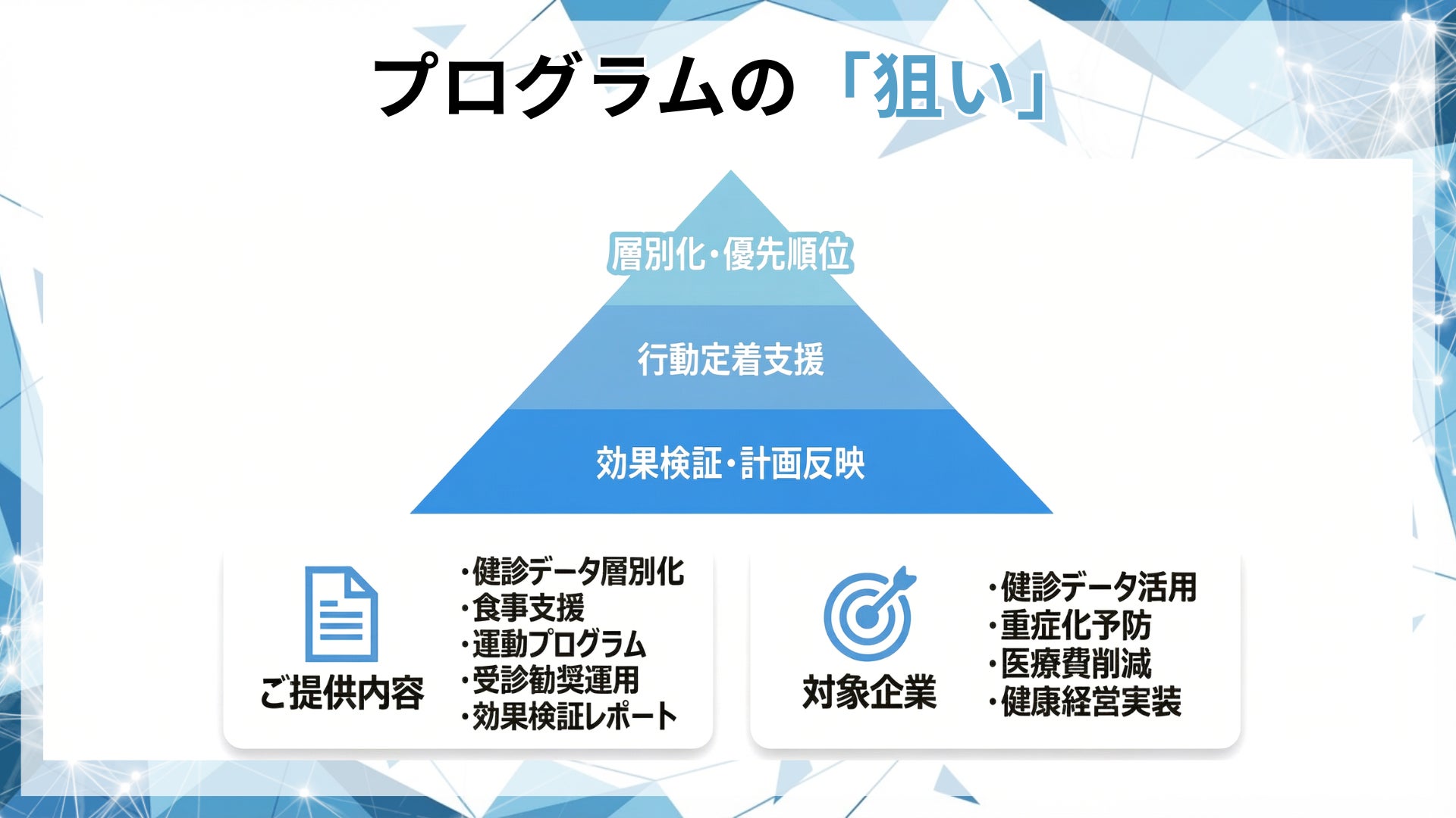 本プログラムは、健診データの層別化から介入設計、実施、効果検証、次年度計画への反映までを最小運用で回せる状態を作ります。