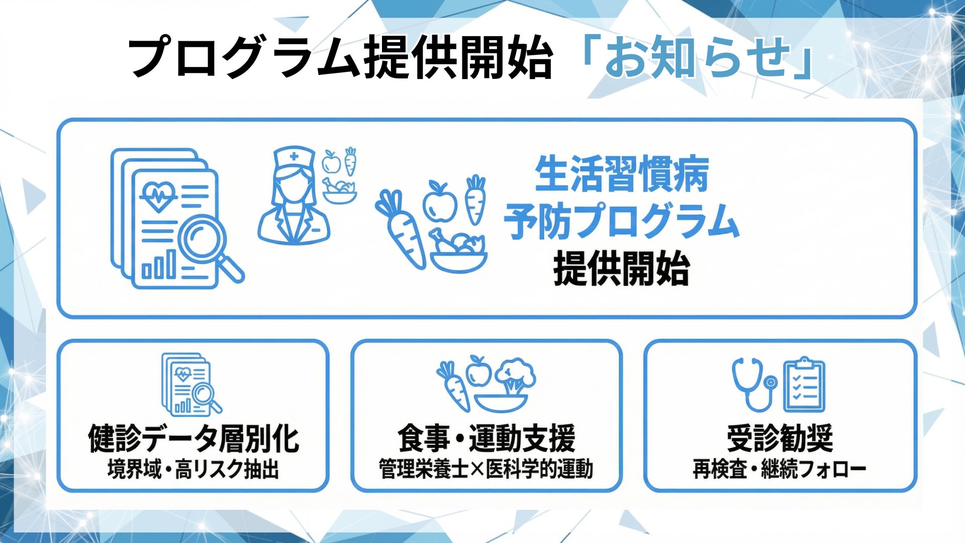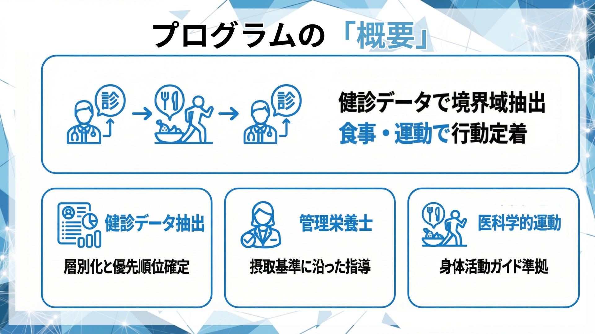 本プログラムは、健診データで境界域・高リスク層を層別化し、管理栄養士の食事支援と医科学的運動で行動を定着させ、再検査・受診勧奨と継続フォローまでを一括運用する生活習慣病予防の実装支援です。