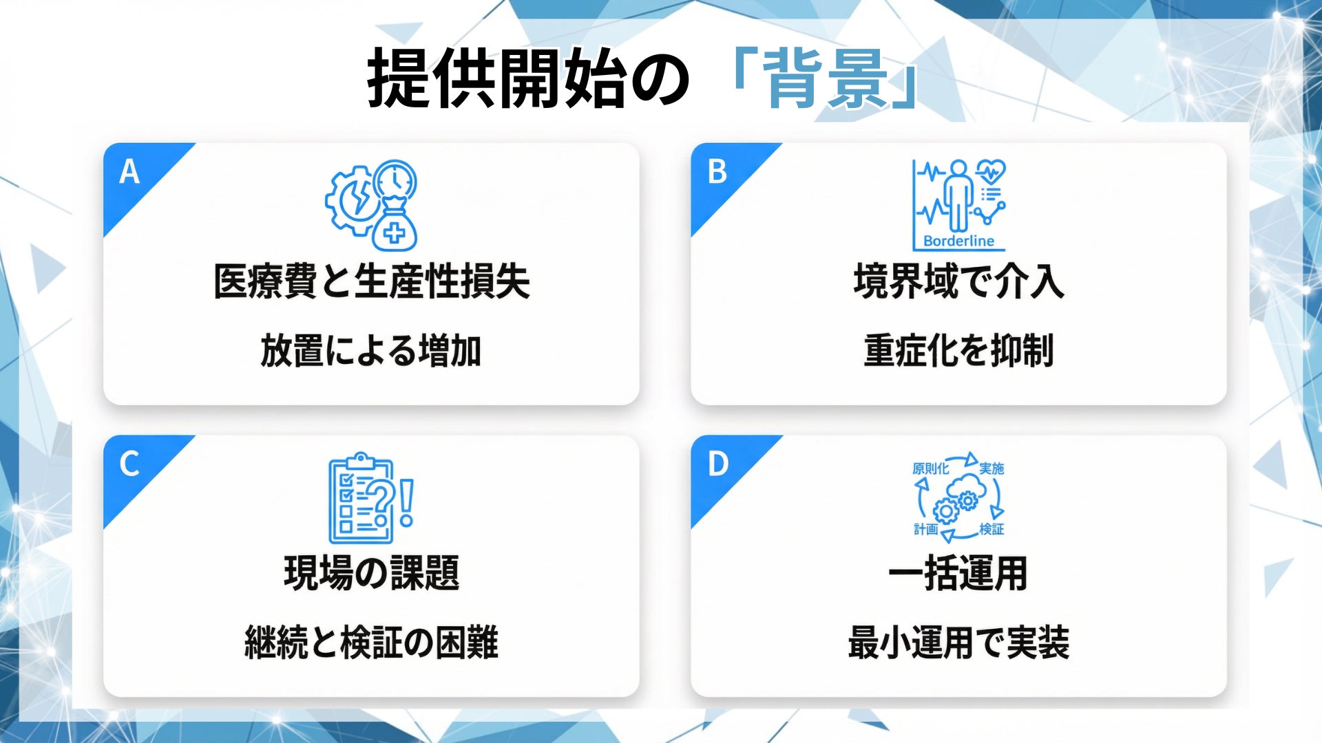 企業としては、発症後の対応ではなく、境界域(予備群)や高リスク層の段階で介入し、重症化を抑えることが費用対効果の高い打ち手になります。
