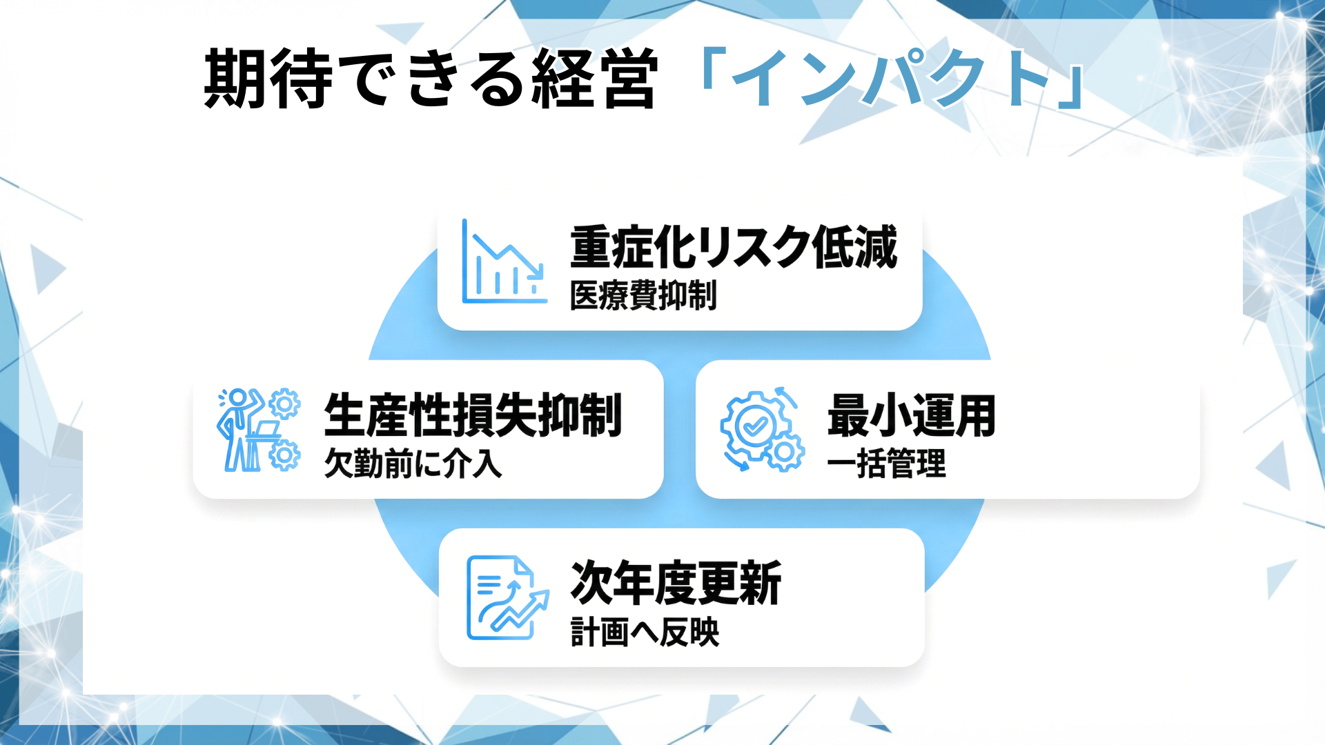 施策を増やすのではなく、リスクの高い層に集中して重症化と生産性損失を抑え、次年度の健康経営計画へ反映できる状態を作ります。