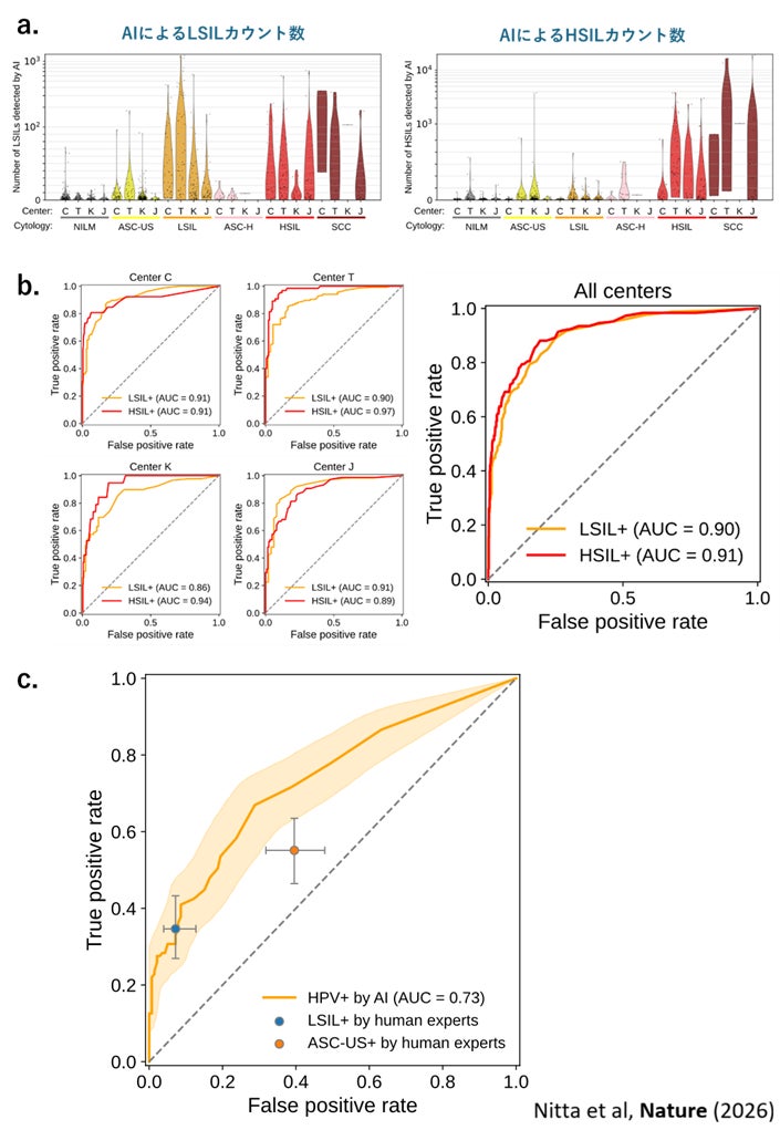図4 AI性能の多施設評価試験結果 | a. がん研有明病院(C)、筑波大学附属病院(T)、下越総合健康開発センター(K)、順天堂大学医学部附属浦安病院(J)の4施設から収集した合計1,124例の子宮頸部液状細胞診検体を用いたAI評価結果。AIはいずれの施設の検体においても、LSIL以上の検体から多数のLSIL細胞を、HSIL以上の検体から多くのHSIL細胞を検出した。 b. 施設ごとのAI性能を評価したROCカーブ。LSIL⁺症例の検出においてAUC 0.86〜0.91、HSIL⁺症例の検出においてAUC 0.89〜0.97と一貫して高い性能が確認された。c. HPV検査結果を正解とした場合の、専門家とAIとによる細胞診精度の比較。専門家のASC-US⁺判定(オレンジ点)と比較して、AIによる判定(オレンジ線)のほうが高精度を示した。