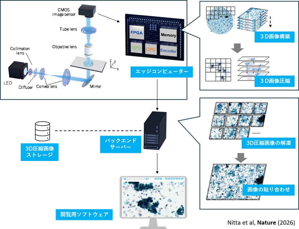図1 「ホールスライド・エッジ・トモグラフィー」の概要 | 装置内のエッジコンピューターがCMOSセンサーで撮像した画像データを速やかに画像処理および画像圧縮することで、大量な画像データをサーバーに高速転送する。画像閲覧時にはリアルタイムで圧縮画像を展開して必要なデータを表示する。この技術は大幅なデータ圧縮を実現し、短時間で大量の高精細画像を蓄積可能とした。