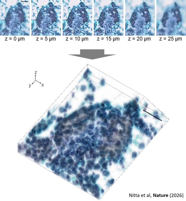 図2 ホールスライド・エッジ・トモグラフィーで撮像した細胞画像例 | 細胞診スライド標本全体を奥行き方向に1μm間隔で40枚撮像。奥行きの位置を徐々にずらすと立体的な細胞集塊の異なる断層面の画像を観察することができる(上部)。さらにこれらの断層画像を積層して、細胞の立体構造を再構成することも可能である(下部)。スケールバーは50μm。