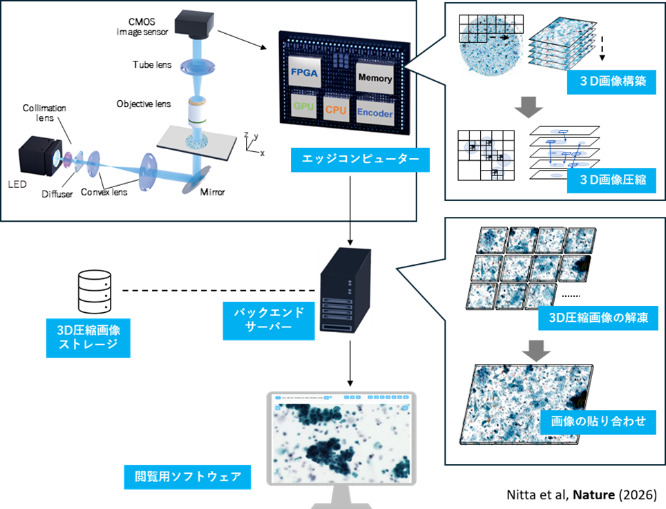 図1 「ホールスライド・エッジ・トモグラフィー」の概要 | 装置内のエッジコンピューターがCMOSセンサーで撮像した画像データを速やかに画像処理および画像圧縮することで、大量な画像データをサーバーに高速転送する。画像閲覧時にはリアルタイムで圧縮画像を展開して必要なデータを表示する。この技術は大幅なデータ圧縮を実現し、短時間で大量の高精細画像を蓄積可能とした。