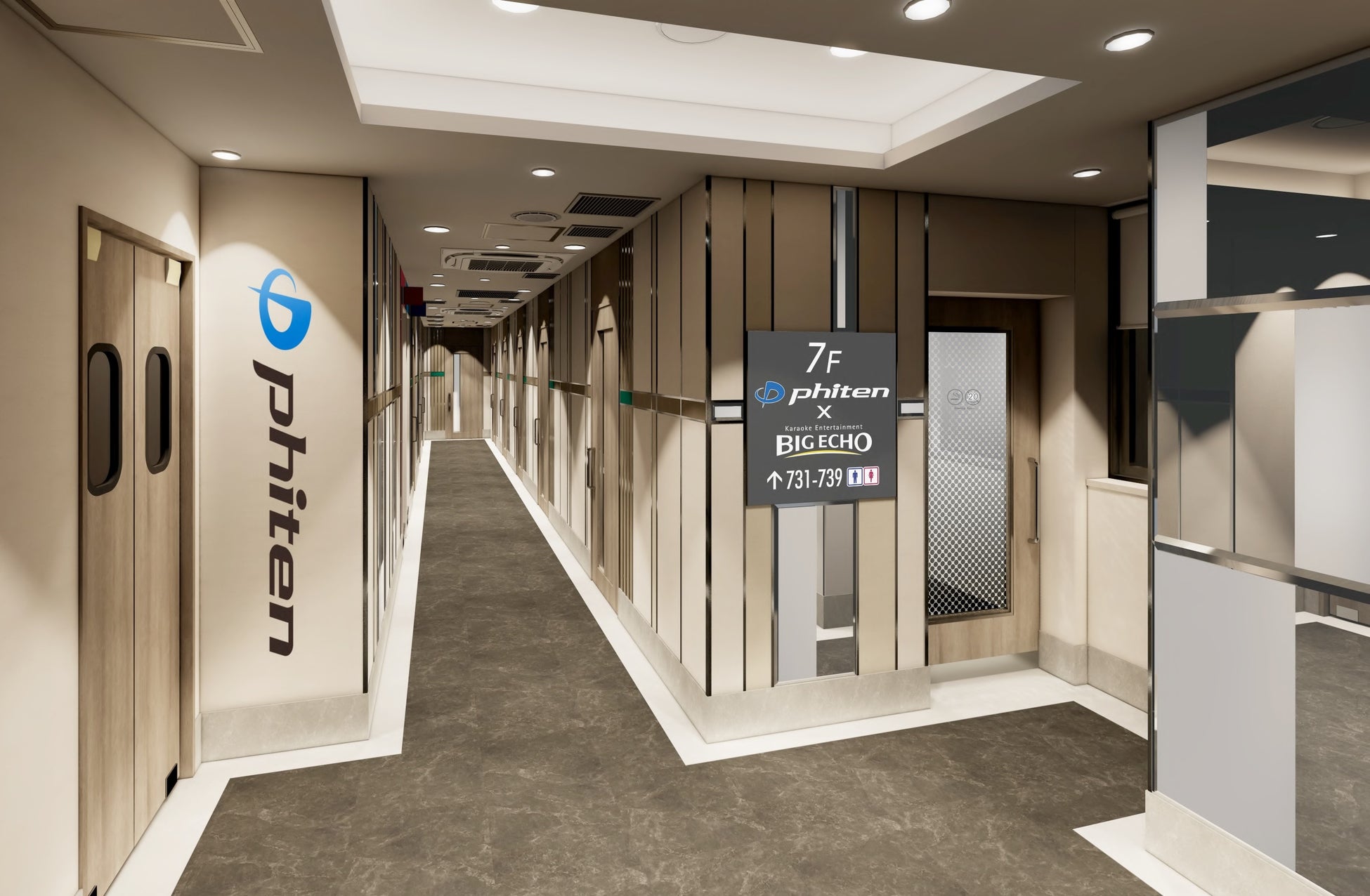 ビッグエコー新橋銀座口駅前店の7階フロア全9ルームおよび通路を健康とリラックスをサポートするアクアチタン技術を使った壁紙で施工します。また、希望者にフットマッサージ器の貸し出しを行うなど、心と体をリフレッシュしながら歌う楽しさを再発見できる空間を創出します。