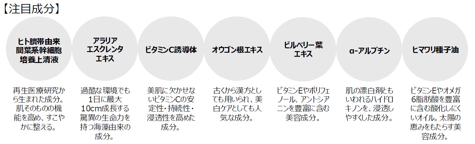 肌をすこやかに保つために欠かせないサイトカインやエクソソームを豊富に含む、再生医療発想の成分、ヒト臍帯由来間葉系幹細胞培養上清液を配合。さらに、スキンケアにも配合される28種の美容成分で紫外線による影響を包括的にケアします。さらに、5つのフリー(紫外線吸収剤・パラベン・合成着色料・合成香料・アルコール)処方で、とことん低刺激に。