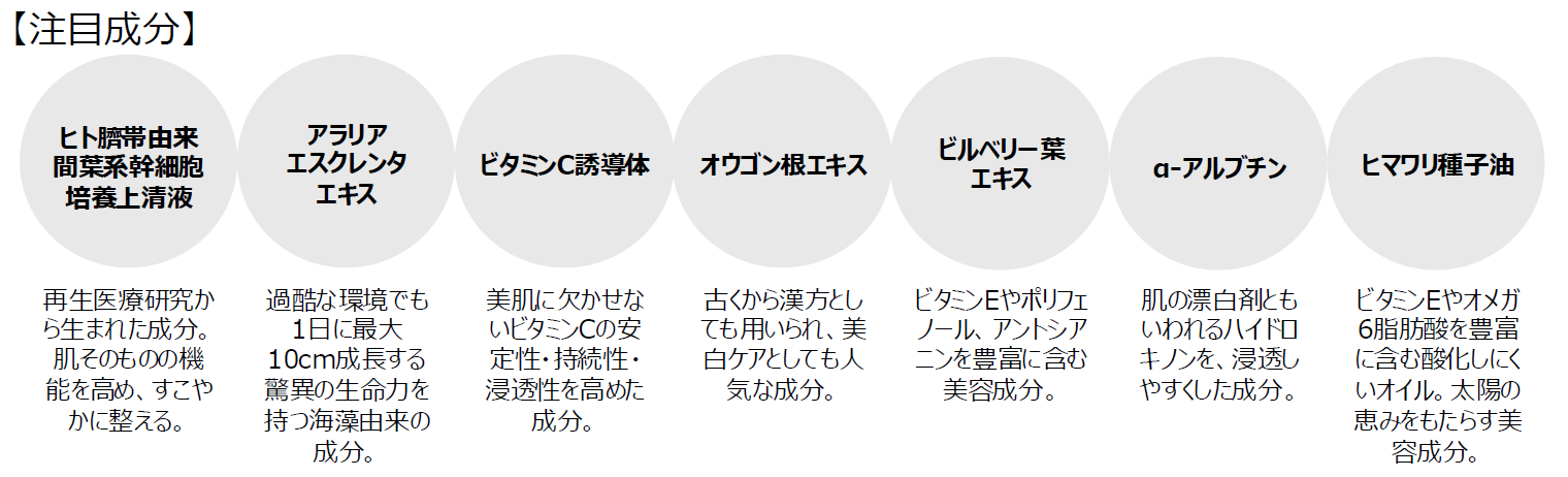 肌をすこやかに保つために欠かせないサイトカインやエクソソームを豊富に含む、再生医療発想の成分、ヒト臍帯由来間葉系幹細胞培養上清液を配合。さらに、スキンケアにも配合される28種の美容成分で紫外線による影響を包括的にケアします。さらに、5つのフリー(紫外線吸収剤・パラベン・合成着色料・合成香料・アルコール)処方で、とことん低刺激に。