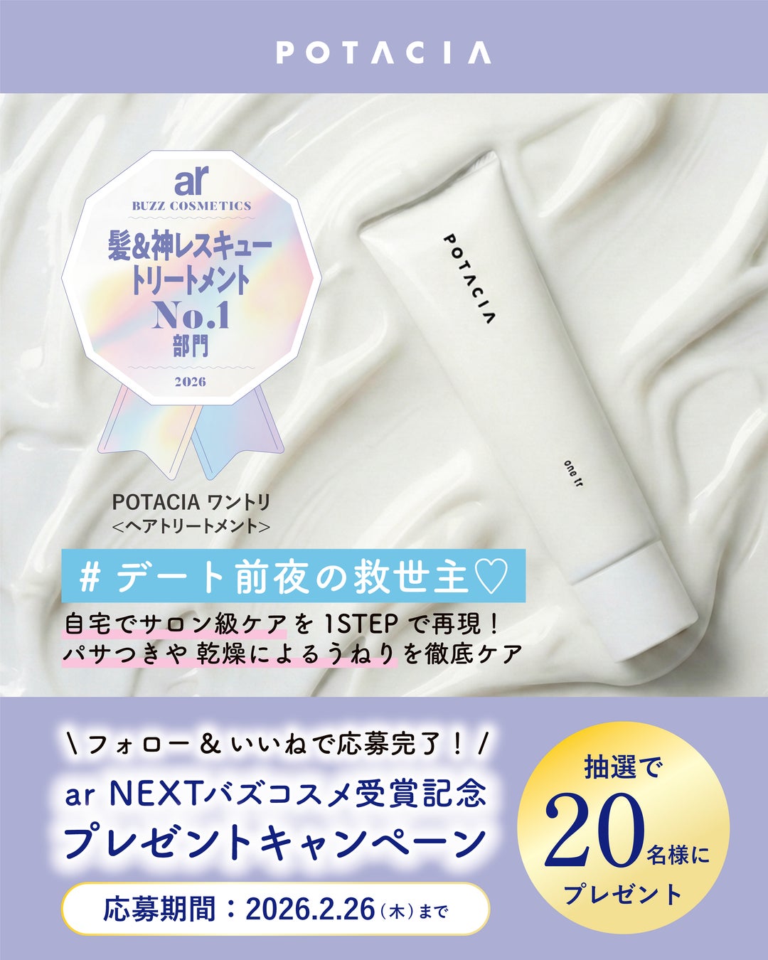 自ら備えている美しくなる力 = ポテンシャルを引き出すスキンケア&ヘアケアブランド、<POTACIA(ポタシャ)>から発売中の「ワントリ」が、雑誌『ar』(主婦と生活社)2026年3月号において、NEXTバズコスメ【髪&神レスキュートリートメント部門】を受賞いたしました。