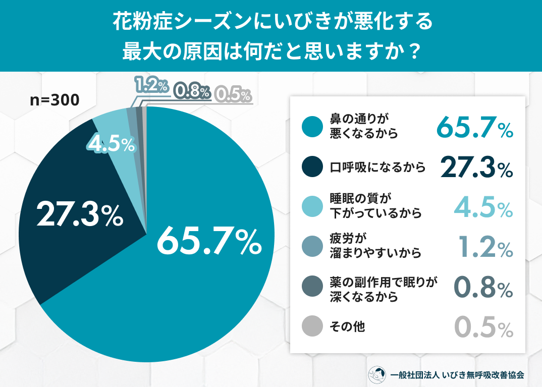 国民病とも言われる花粉症。くしゃみや鼻水、目のかゆみに注目が集まりがちですが、実は「睡眠」にも深刻な影を落としています。一般社団法人 いびき無呼吸改善協会は、花粉症の症状がある300名を対象に「花粉症シーズンのいびき悪化」に関する実態調査を実施しました。その結果、半数を超える56.0%の人が花粉症シーズンにいびきの悪化を自覚しており、その原因の多くが「鼻づまり」や「口呼吸」に起因していることが判明しました。いびきの悪化は単なる騒音問題に留まらず、約6割の人の日常生活に支障をきたす「負のループ」を生み出している実態が見えてきました。
