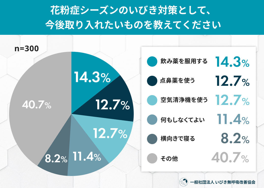 • その他:40.7%(鼻腔拡張テープを使う:8.1%、鼻うがいをする:7.7%、加湿器を使う:7.7% など)