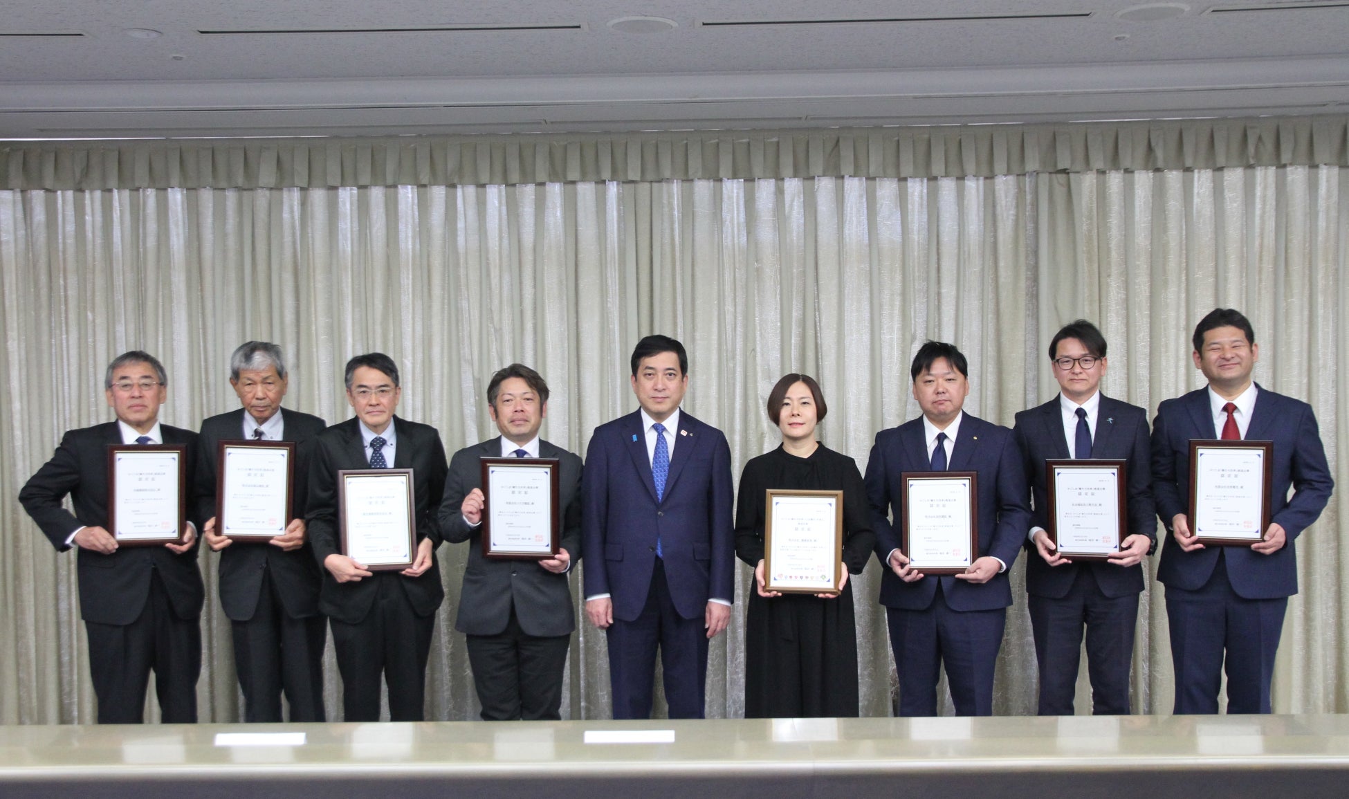 今回の交付式では、「かごしま『働き方改革』推進企業」として7社が選定されました。あわせて育児と仕事の両立促進に特に力を入れる企業を対象とした『働き方改革プラス共働き・共育て』推進企業として、株式会社健康家族が選定されました。