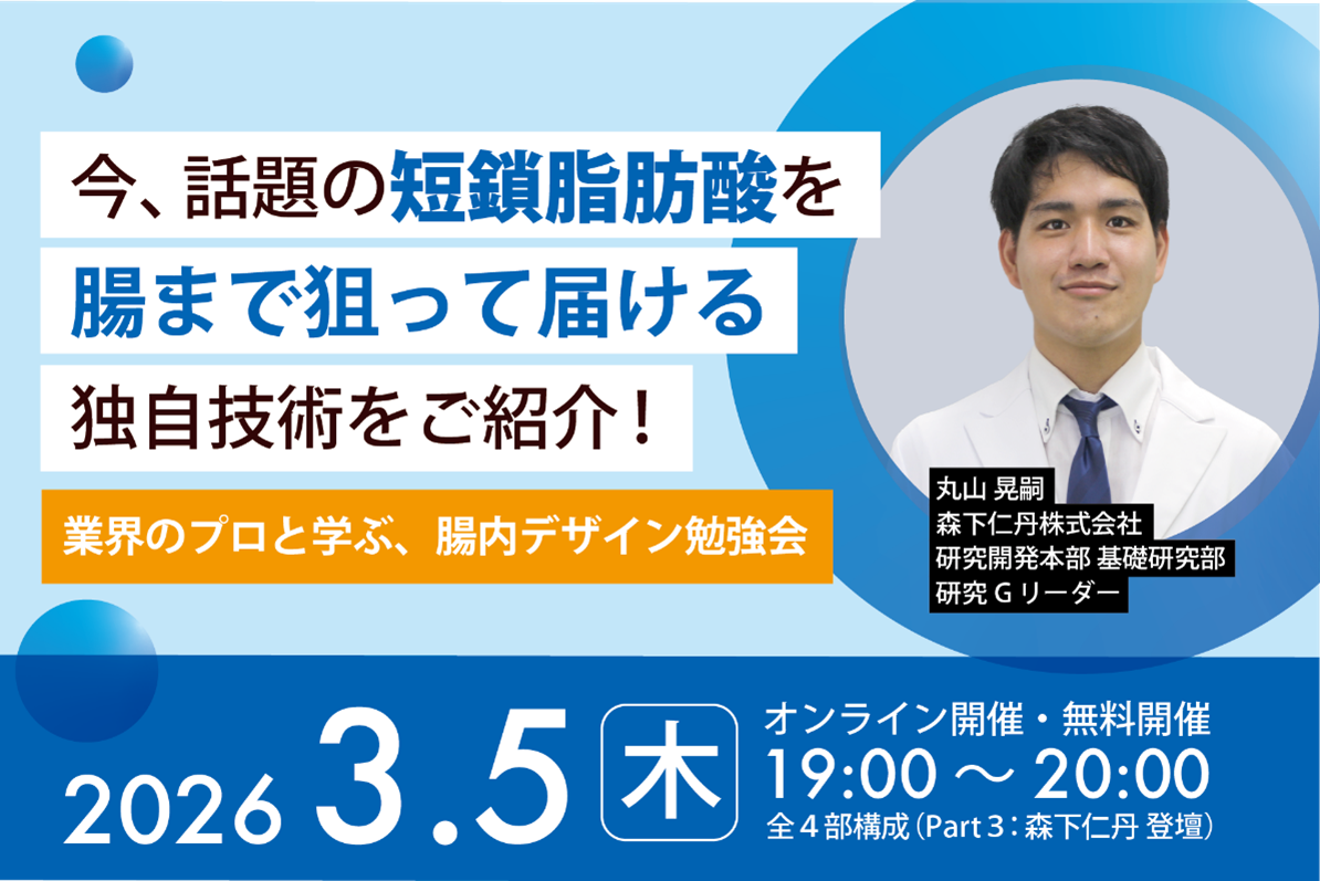 本セミナーは、2026年1月26日の「腸内フローラの日」から3月4日の「短鎖脂肪酸の日」を含む3月末までの「腸内デザインMonths」の取り組みの一環として開催いたします。当社は、第2回目となる2026年3月5日(木) 19:00からのプログラム(Part3)に登壇し、独自のシームレスカプセル製剤技術を活用した「タンサ脂肪酸」に関する知見をご紹介いたします。