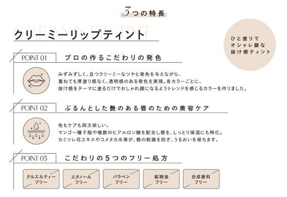 みずみずしく、且つクリーミーなツヤと発色を与えながら、重ねても厚塗り感なく、透明感のある発色を実現。各カラーごとに、抜け感をテーマに塗るだけでおしゃれ顔になるようトレンドを感じるカラーを作りました。