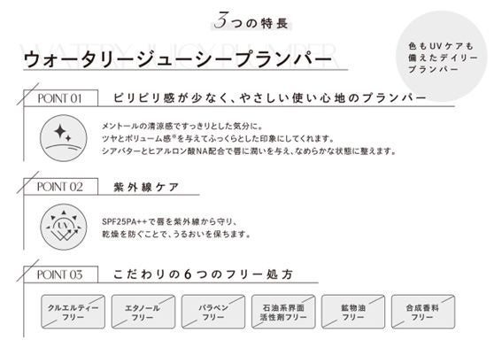 ※クリーミーリップティントとウォータリージューシープランパーをあわせて使うことで、発色とツヤと紫外線ケアができます。