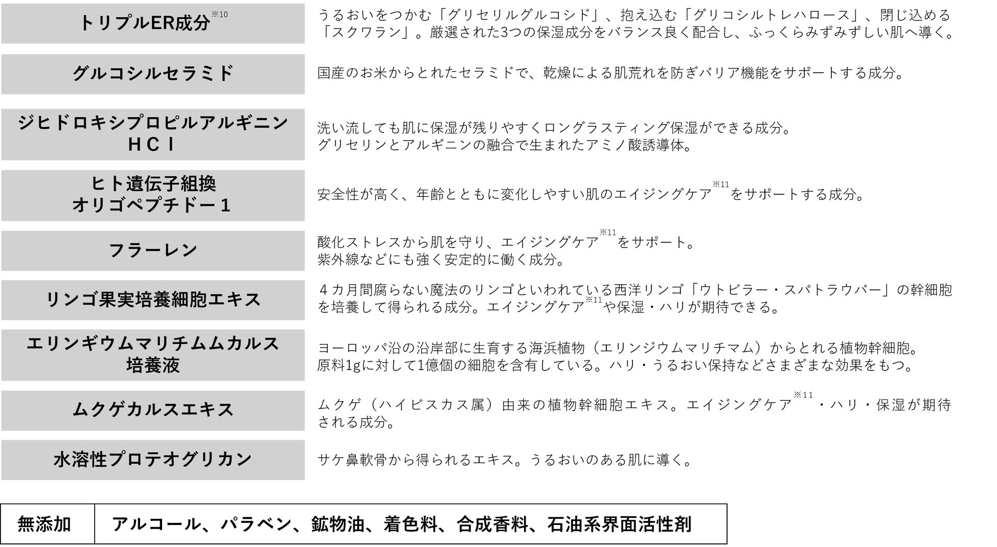 <全成分>水、グリセリン、BG、加水分解卵殻膜、水添レシチン、フィトステロールズ、スクワラン、イノシトール、ラフィノース、グリセリルグルコシド、グルコシルセラミド、グリコシルトレハロース、ジヒドロキシプロピルアルギニンHCl、ヒト遺伝子組換オリゴペプチド-1、フラーレン、加水分解ヒアルロン酸、加水分解コラーゲン、リンゴ果実培養細胞エキス、エリンギウムマリチムムカルス培養液、ムクゲカルスエキス、水溶性プロテオグリカン、ヒアルロン酸Na、水溶性コラーゲン、オレンジ果皮油、グレープフルーツ果皮油、ニオイテンジクアオイ油、α-グルカン、マンニトール、レシチン、1,2-ヘキサンジオール、PPG-6デシルテトラデセス-20、(PCA/イソステアリン酸)グリセレス-25、加水分解水添デンプン、PVP、キサンタンガム、PEG-60水添ヒマシ油、フェノキシエタノール