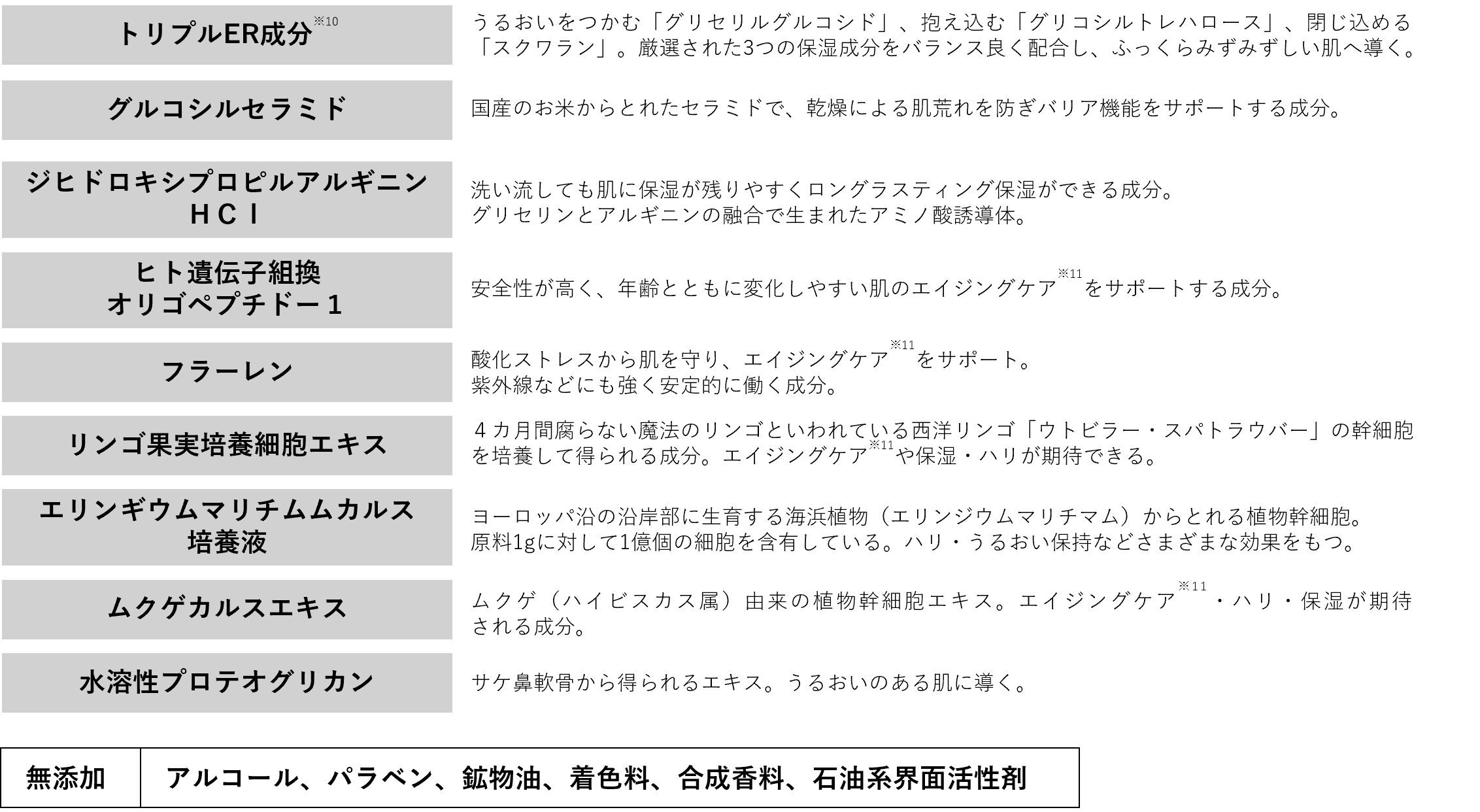 <全成分>水、グリセリン、BG、加水分解卵殻膜、水添レシチン、フィトステロールズ、スクワラン、イノシトール、ラフィノース、グリセリルグルコシド、グルコシルセラミド、グリコシルトレハロース、ジヒドロキシプロピルアルギニンHCl、ヒト遺伝子組換オリゴペプチド-1、フラーレン、加水分解ヒアルロン酸、加水分解コラーゲン、リンゴ果実培養細胞エキス、エリンギウムマリチムムカルス培養液、ムクゲカルスエキス、水溶性プロテオグリカン、ヒアルロン酸Na、水溶性コラーゲン、オレンジ果皮油、グレープフルーツ果皮油、ニオイテンジクアオイ油、α-グルカン、マンニトール、レシチン、1,2-ヘキサンジオール、PPG-6デシルテトラデセス-20、(PCA/イソステアリン酸)グリセレス-25、加水分解水添デンプン、PVP、キサンタンガム、PEG-60水添ヒマシ油、フェノキシエタノール