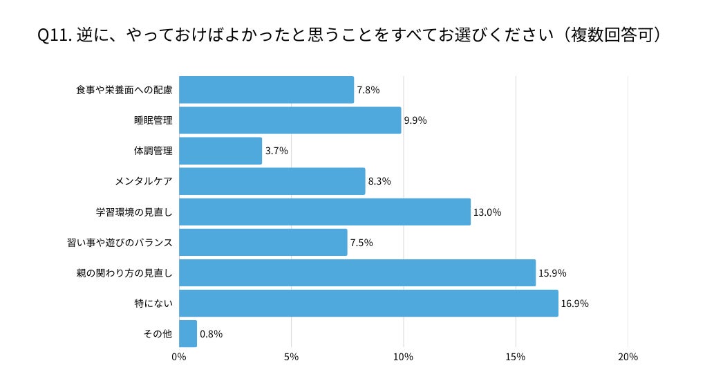 厳しく管理するべきか、任せるべきか――正解が見えにくい中で試行錯誤していた保護者の葛藤がうかがえます。また、「睡眠管理」(16.8%)や「食事や栄養面への配慮」(13.2%)など、生活面に関する項目も一定数挙がっており、当時は精一杯だったものの、振り返ると生活リズムや心身のコンディション面に改善の余地があったと感じている保護者が多いことが読み取れます。