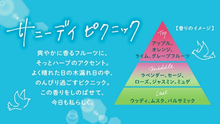 今年は「よく晴れた日の木漏れ日」を連想させる香りとして「サニーデイピクニック」の香りを数量限定発売いたします。外で日を浴びたくなる春先に、「サニーデイピクニック」の香りを通じて、「日々の喧騒から離れて友達とピクニックをする」というゆったりとした時間を感じて貰いたいという思いや、前向きに過ごしてほしいというビオレの想いを込めています。