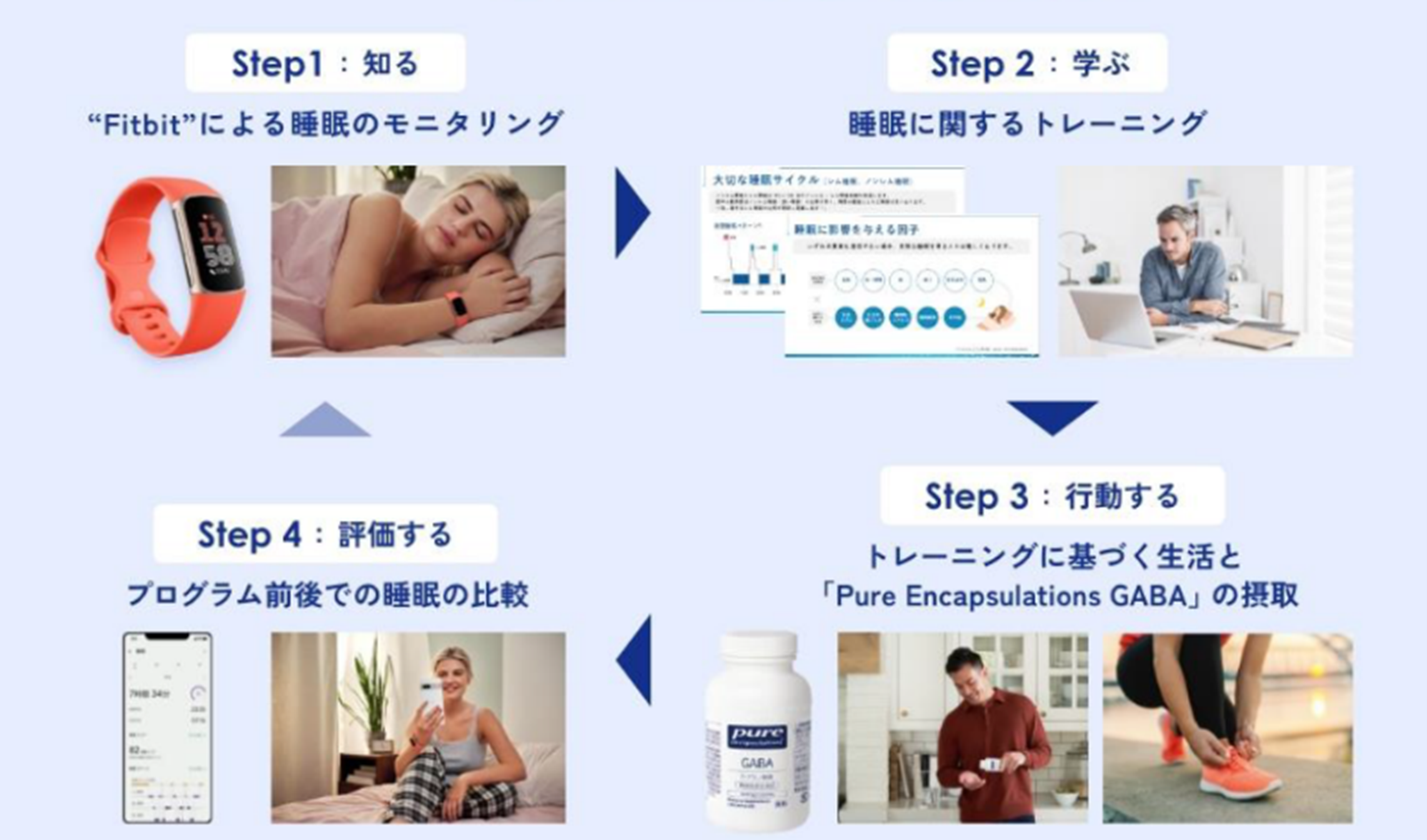 「ネスレ ヘルスサイエンス睡眠プログラム with Fitbit」は、従業員の心身の健康を睡眠の観点からサポートすることを目的としており、Fitbitによる睡眠モニタリング、良い睡眠習慣習得のための睡眠トレーニング、機能性表示食品に含まれるGABA成分の3つの側面を組み合わせ、各企業さまの状況に合わせたプログラムをご提供します。当プログラムは、健康経営に取り組む法人向けで、企業や医療機関が、お申込み後ご利用いただけます。