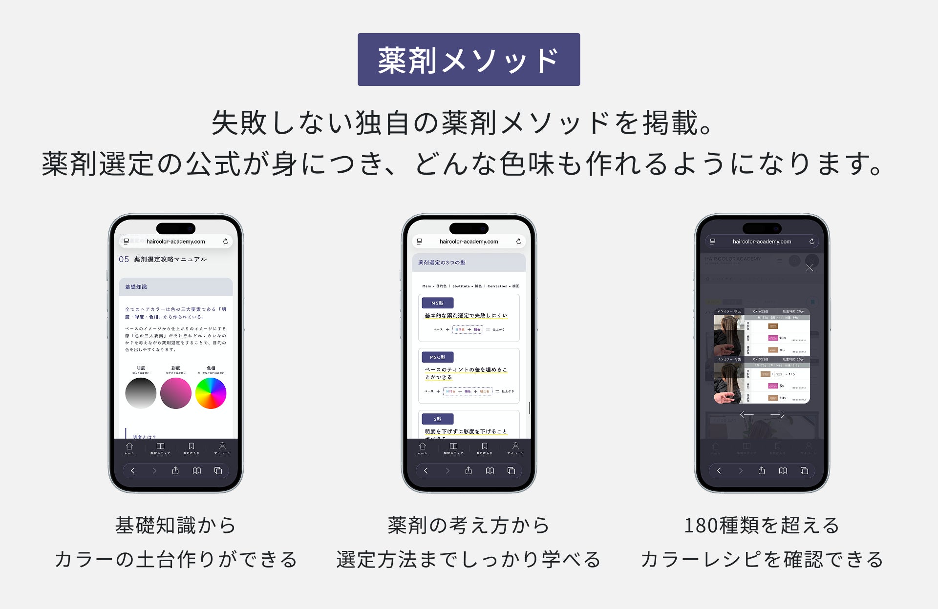 HAIR COLOR ACADEMYは、「ヘアカラーを、自由自在に。」をコンセプトに、ヘアカラーのスキルを1から学べるヘアカラー専門オンラインスクールです。