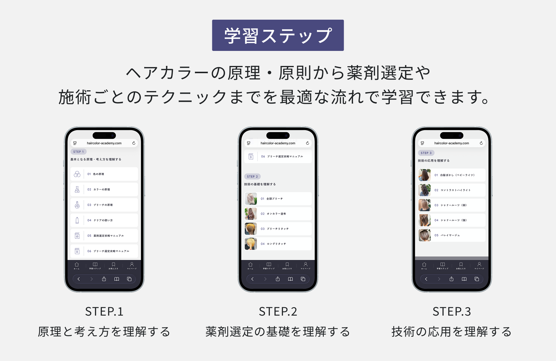 これらの課題を解決するために、「HAIR COLOR ACADEMY法人プラン」は、ヘアカラー技術を体系的に学べる環境を提供し、サロン全体の技術レベルを統一・向上させることを目的に開発しました。
