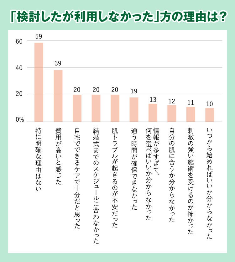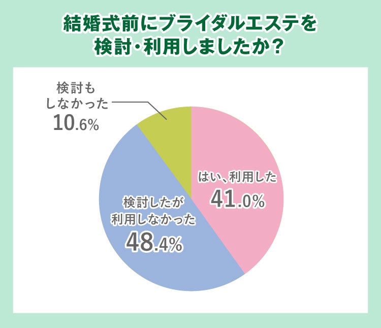 調査の結果、「はい、利用した」と回答した方は約41%、「検討したが利用しなかった」方は約48%と、多くの人が一度はブライダルエステを意識していることが分かりました。