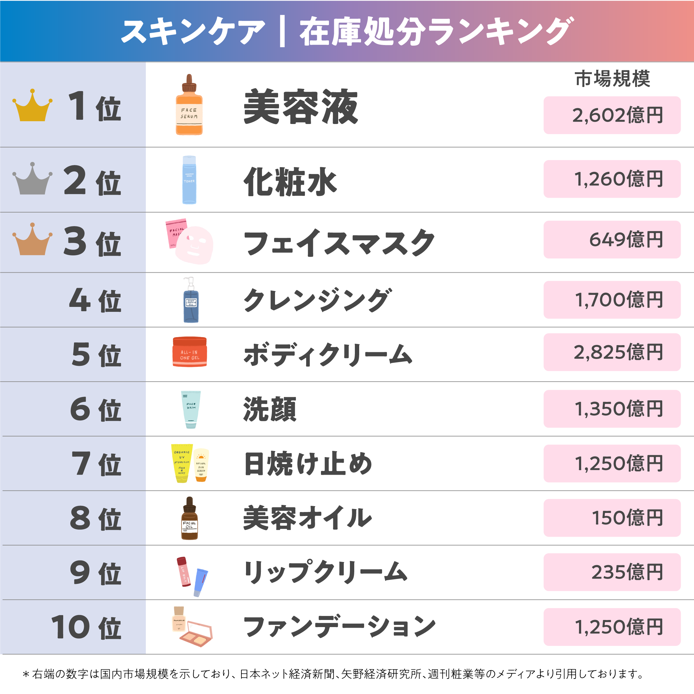株式会社ビューズは、化粧品メーカー様から日々寄せられた624商品の在庫処分に関するご相談をもとに、「総合」とヘアケアを省いた「スキンケア」部門の二つに分けて「在庫処分相談ランキングTOP10」を集計・発表いたしました。今後の化粧品企画の注意点として活用いただければと思います。