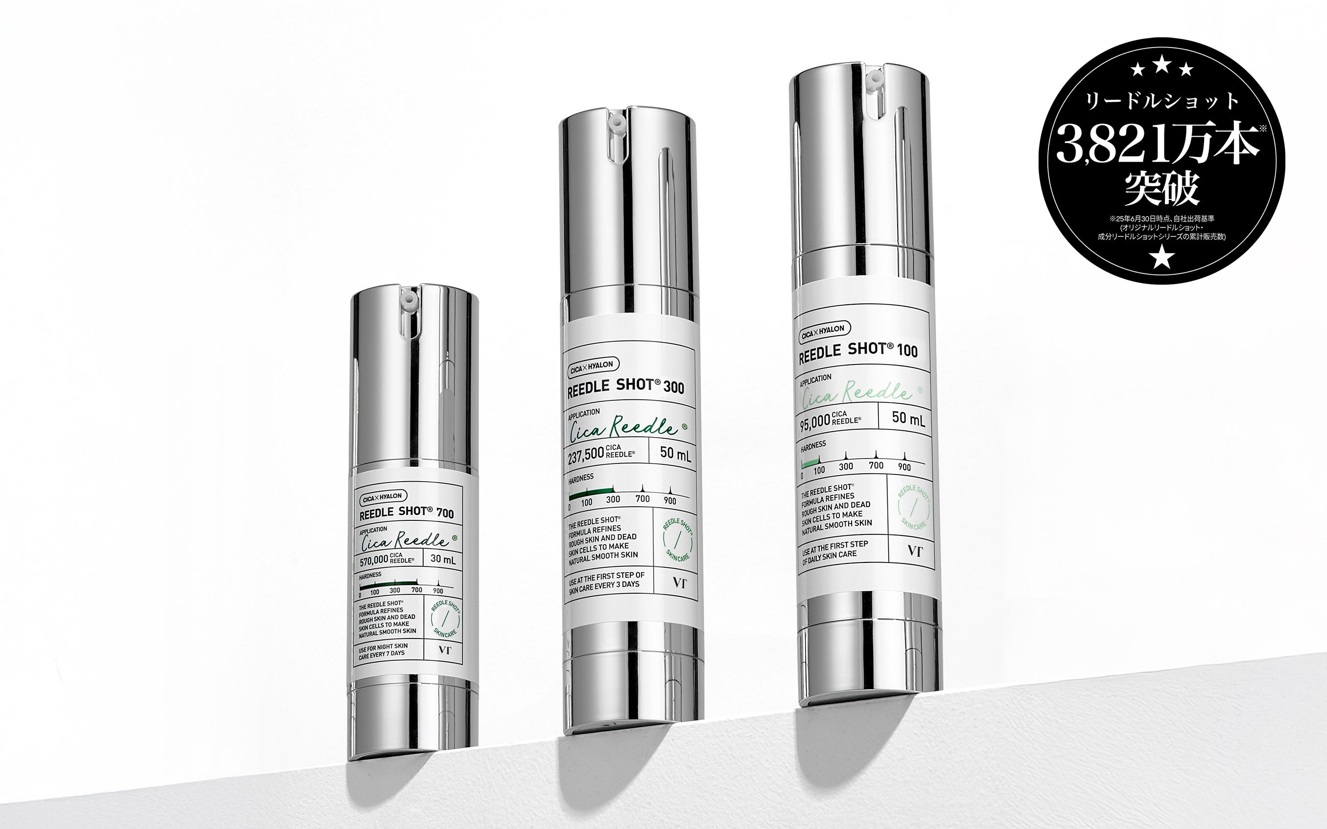 リードルショットシリーズは100を基準に300・700…と天然マイクロニードル※12の配合量が高くなります。体もダンベルのレベルを上げて鍛えていくように、今の肌レベルにあったリードルショットを選ぶことが肌育には重要!