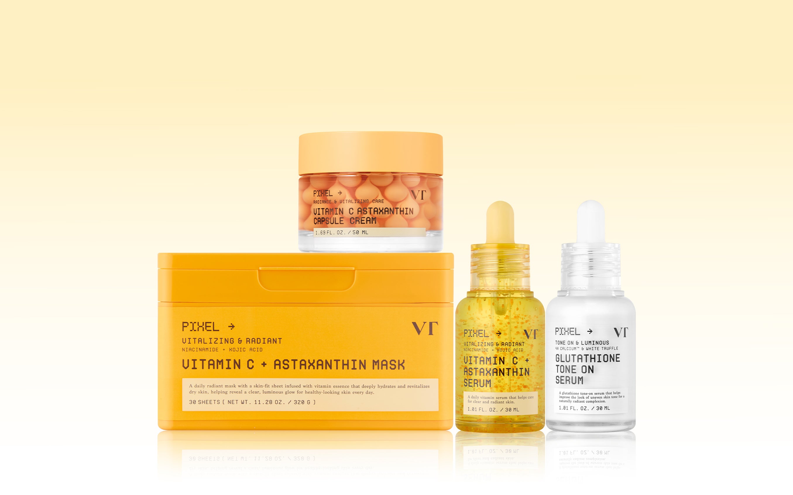 VTにこれまでなかったアスタキサンチン※2入りデイリーマスク! 日本のそこそこ高価格帯スキンケアにも配合されている成分。それがビタミンC※1と一緒に、30日毎日使えるデイリーマスクに配合で、ぱっと透明肌※3へ導きます。