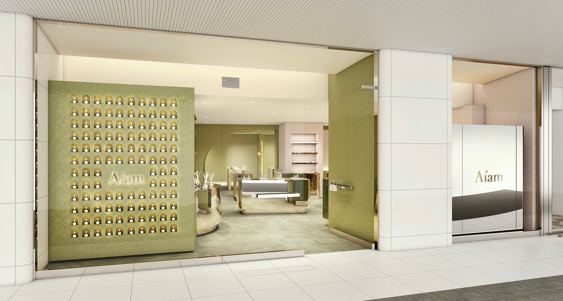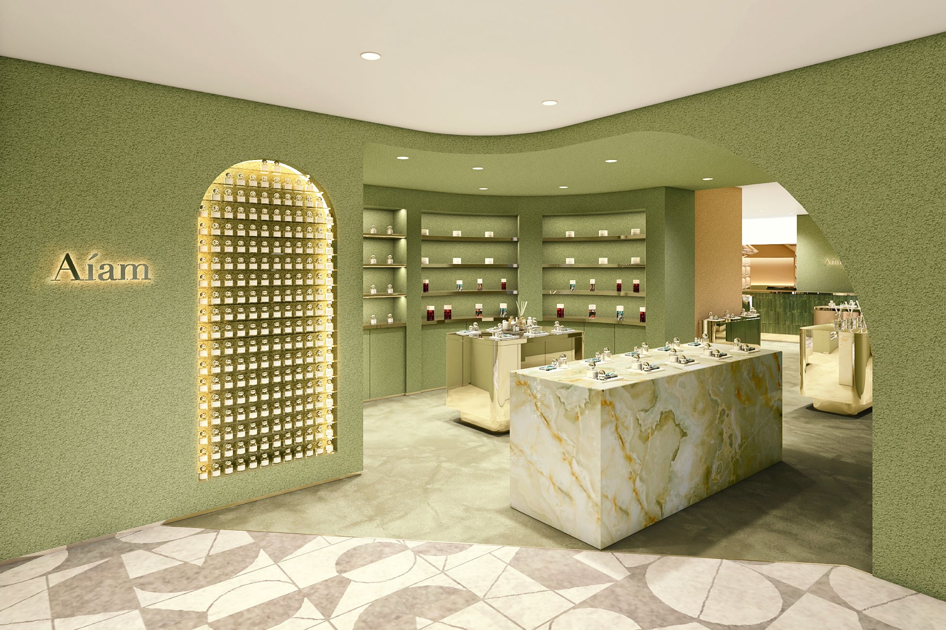 奥行きのある動線と落ち着いたグリーンを基調とした内装に、やわらかな統一感の中で適度な変化を持たせることで、Aíamらしい上質さはそのままに、新たな表情をお楽しみいただけます。