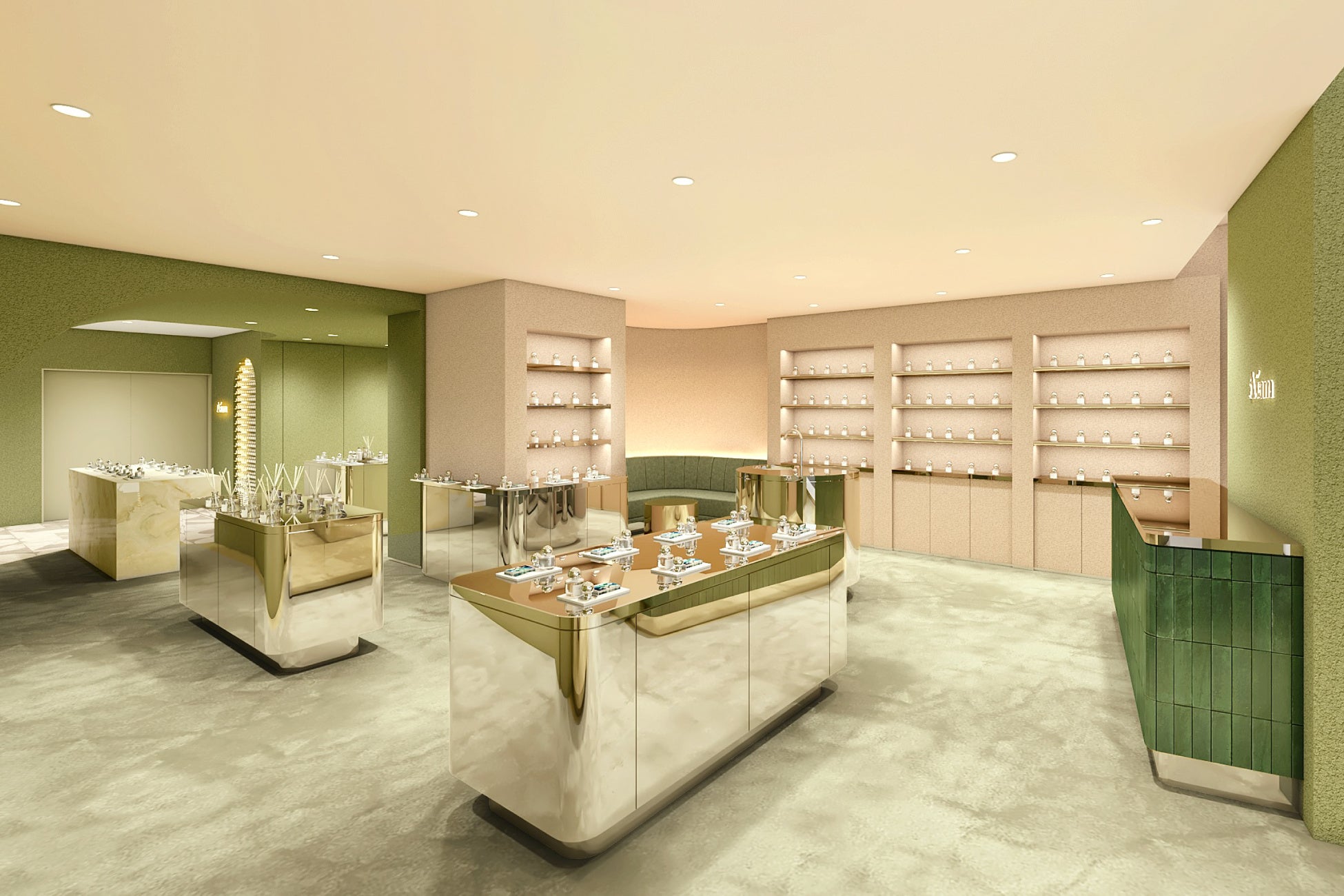 奥行きのある動線と落ち着いたグリーンを基調とした内装に、やわらかな統一感の中で適度な変化を持たせることで、Aíamらしい上質さはそのままに、新たな表情をお楽しみいただけます。