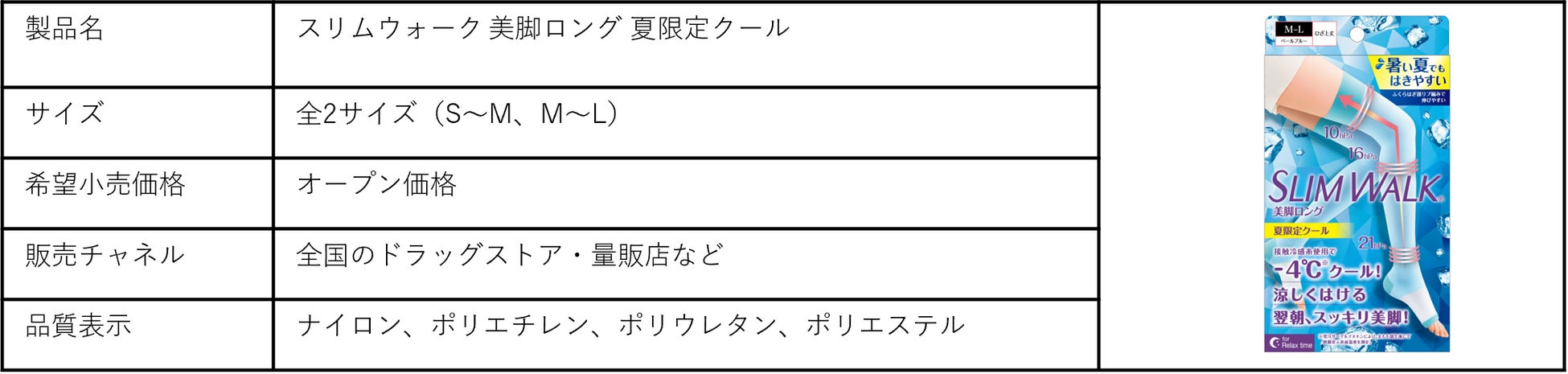このような背景から、今夏もスリムウォークは「美脚ロング 夏限定クール」を発売するに至りました。「美脚ロング 夏限定クール」は、夏の就寝時の快適な美脚ケアを実現し、翌朝の脚をスッキリと整えます。