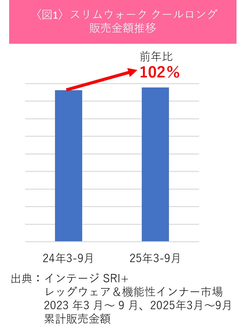 スリムウォークが夏期に発売しているクールタイプの着圧ソックスは、例年ご好評いただいています。 2025年に発売した「美脚ロング 夏限定クール」は、2024年発売のクールタイプ商品と比較して、前年比102%と売上が伸長しました<図1>。「美脚ロング 夏限定クール」はスリムウォーク初の「シアー素材」を足もとに使用しており、ユーザーからは涼しさや快適な履き心地が高く評価されています。