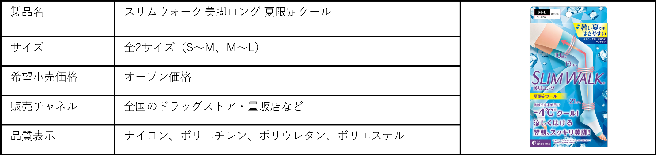 このような背景から、今夏もスリムウォークは「美脚ロング 夏限定クール」を発売するに至りました。「美脚ロング 夏限定クール」は、夏の就寝時の快適な美脚ケアを実現し、翌朝の脚をスッキリと整えます。