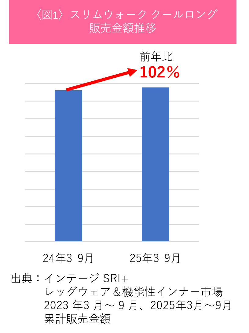 スリムウォークが夏期に発売しているクールタイプの着圧ソックスは、例年ご好評いただいています。 2025年に発売した「美脚ロング 夏限定クール」は、2024年発売のクールタイプ商品と比較して、前年比102%と売上が伸長しました<図1>。「美脚ロング 夏限定クール」はスリムウォーク初の「シアー素材」を足もとに使用しており、ユーザーからは涼しさや快適な履き心地が高く評価されています。