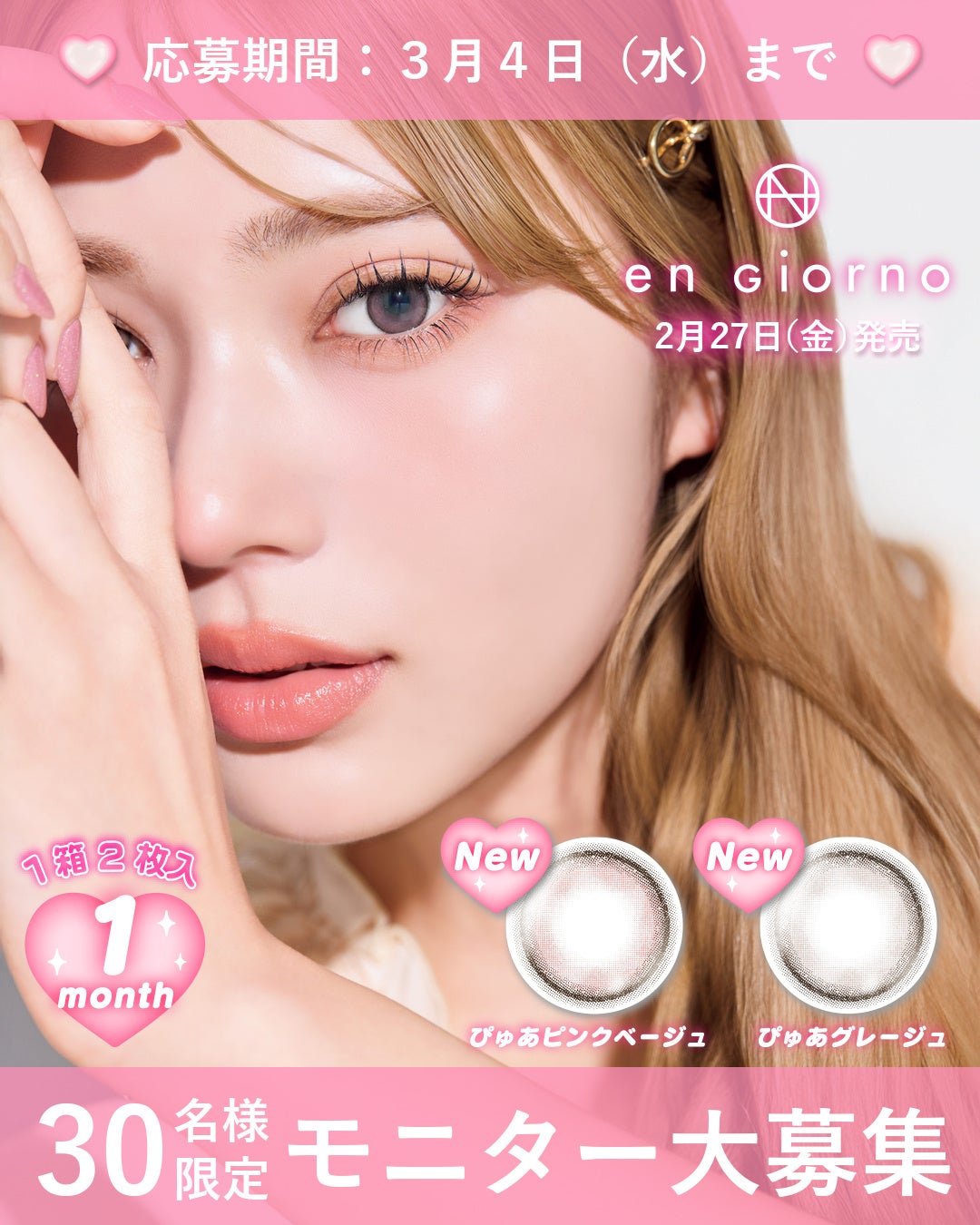 化粧品、化粧雑貨、服飾雑貨及びキャラクター雑貨等の企画・製造・販売、コンタクトレンズの企画・販売を行う粧美堂株式会社(本社:東京都港区、代表取締役社長:寺田正秀、以下 粧美堂)は、直営ECサイト「粧美堂 ONLINE STORE」で展開するオリジナルカラーコンタクトレンズブランド「en Giorno(アンジョルノ)」のぴゅあシリーズより新色2色『ぴゅあピンクベージュ』、『ぴゅあグレージュ』を2月27日(金)にメガ割期間に合わせてQoo10粧美堂オンラインストアにて先行販売およびInstagramモニター募集を実施します。