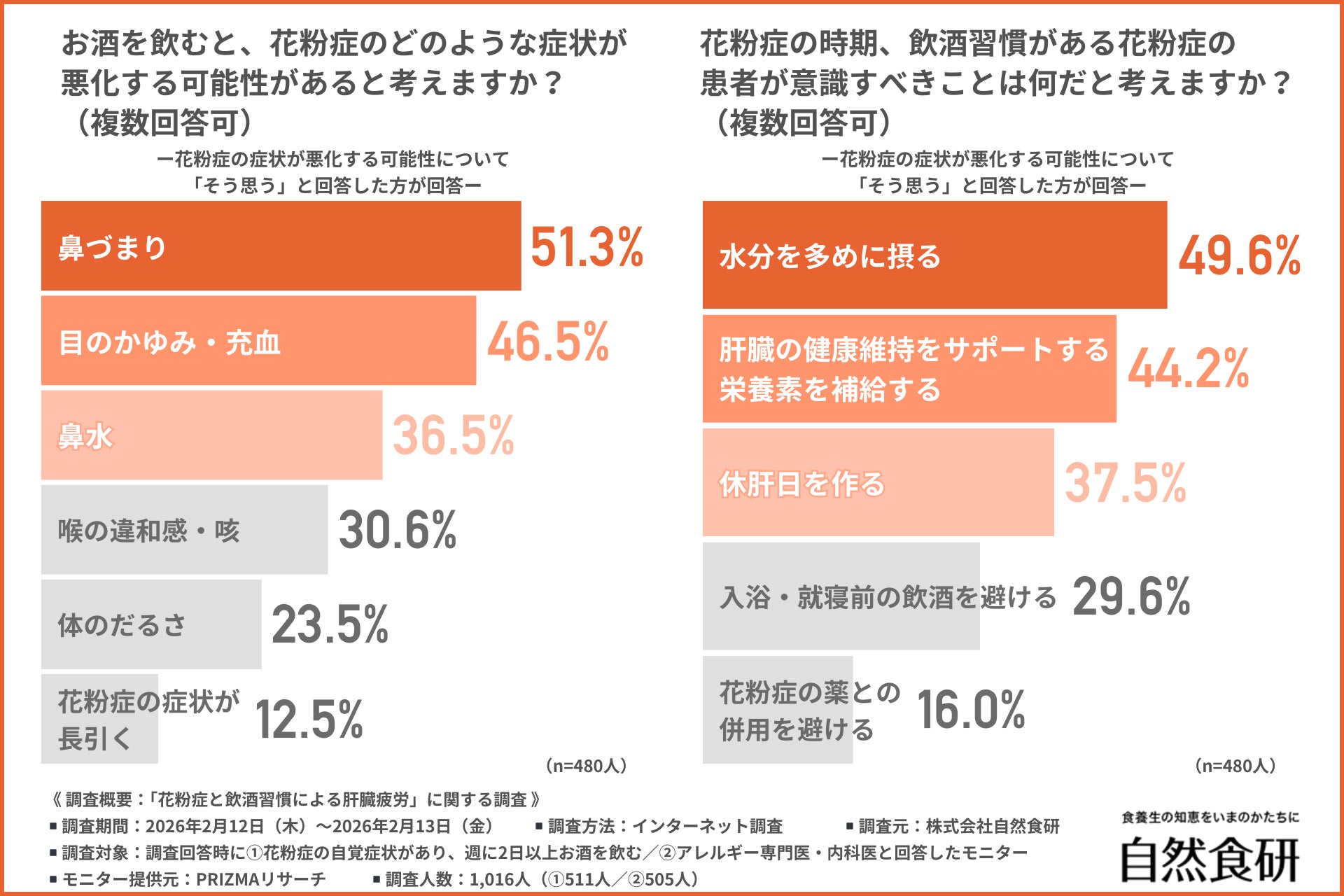 株式会社自然食研(所在地:大分県豊後高田市、代表者:佐々木 興平)は、①花粉症の自覚症状があり、週に2日以上お酒を飲む方/②アレルギー専門医・内科医を対象に、「花粉症と飲酒習慣による肝臓疲労」に関する調査を行いました。