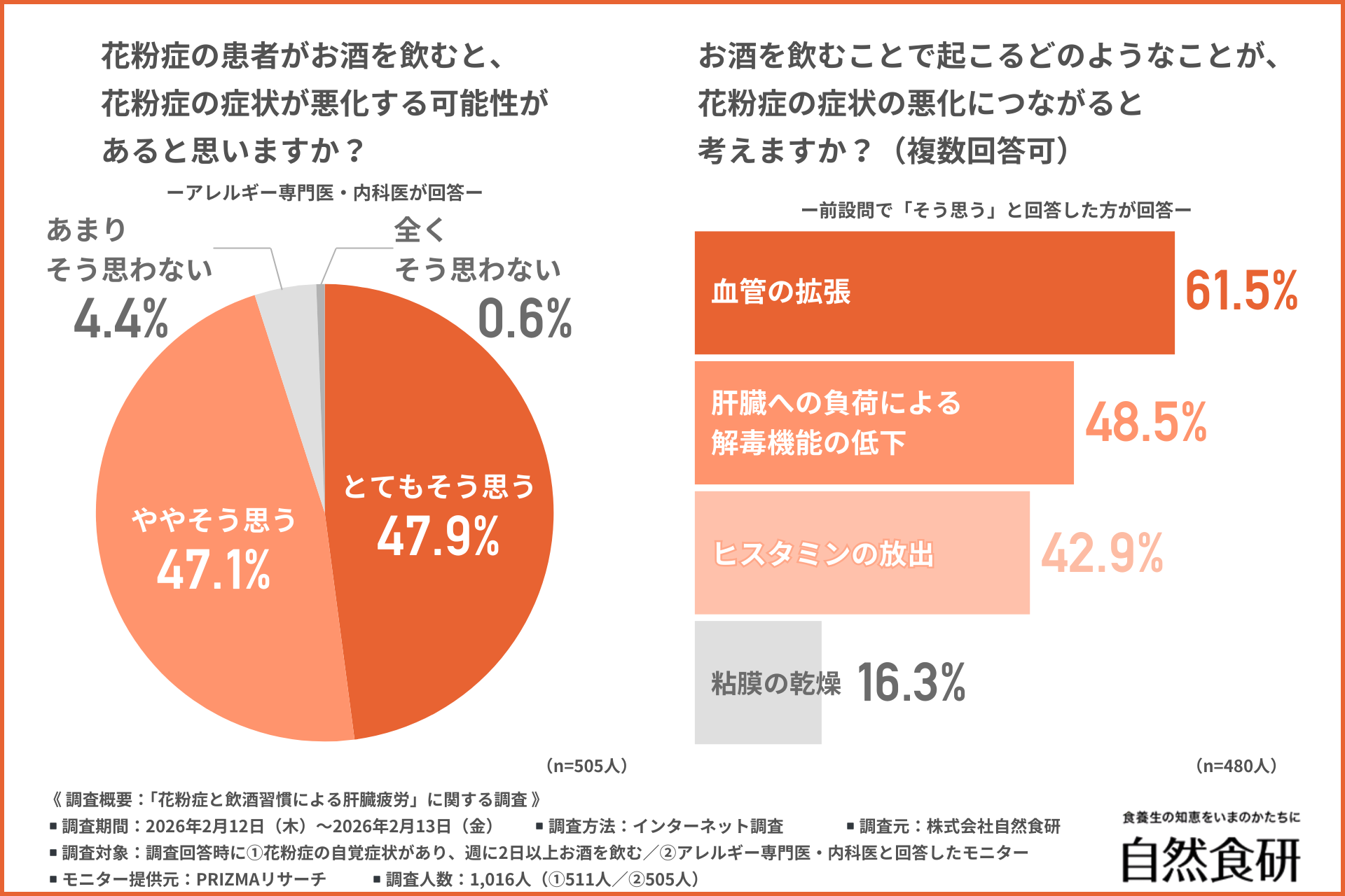 株式会社自然食研(所在地:大分県豊後高田市、代表者:佐々木 興平)は、①花粉症の自覚症状があり、週に2日以上お酒を飲む方/②アレルギー専門医・内科医を対象に、「花粉症と飲酒習慣による肝臓疲労」に関する調査を行いました。