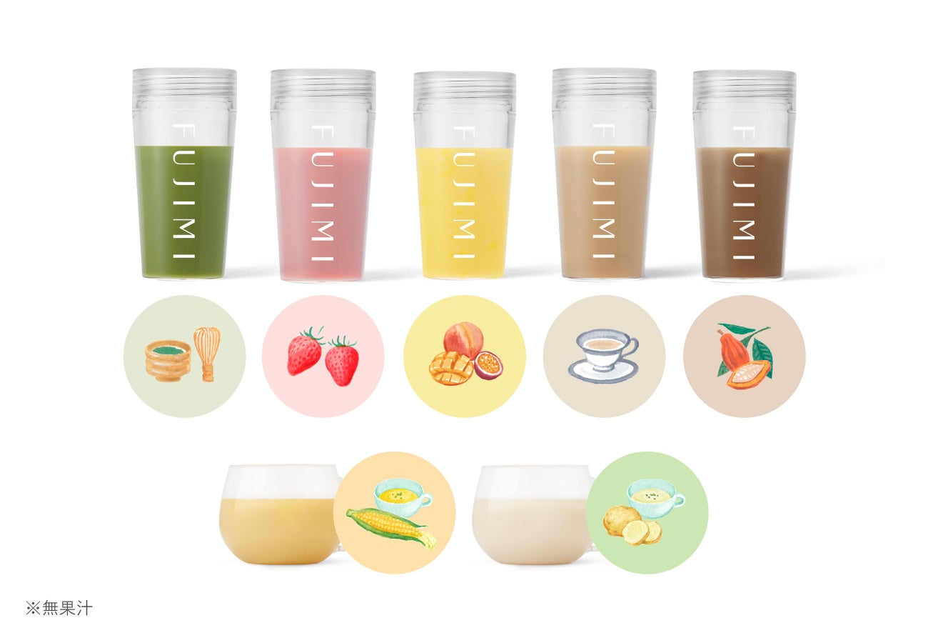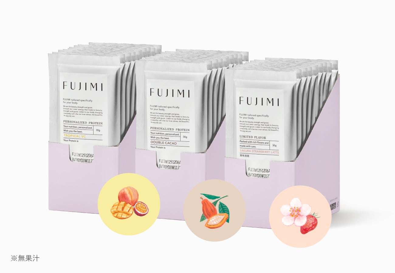 FUJIMIプロテインは独自のパーソナライズ分析からあなたの今のカラダ状態とライフスタイルに基づいて必要な栄養成分を豊富に配合したプロテインです。45種類以上の栄養成分からあなたにぴったりの成分を配合したプロテインをセレクトいたします。味はリッチストロベリーミルク、エクストラ抹茶ミルク、ロイヤルミルクティー、ダブルカカオ、トロピカルVC、コーンクリーム、ポテトクリーム、数量限定のトマトクリーム風味、さくらストロベリーラテ風味の10種類をご用意しております。