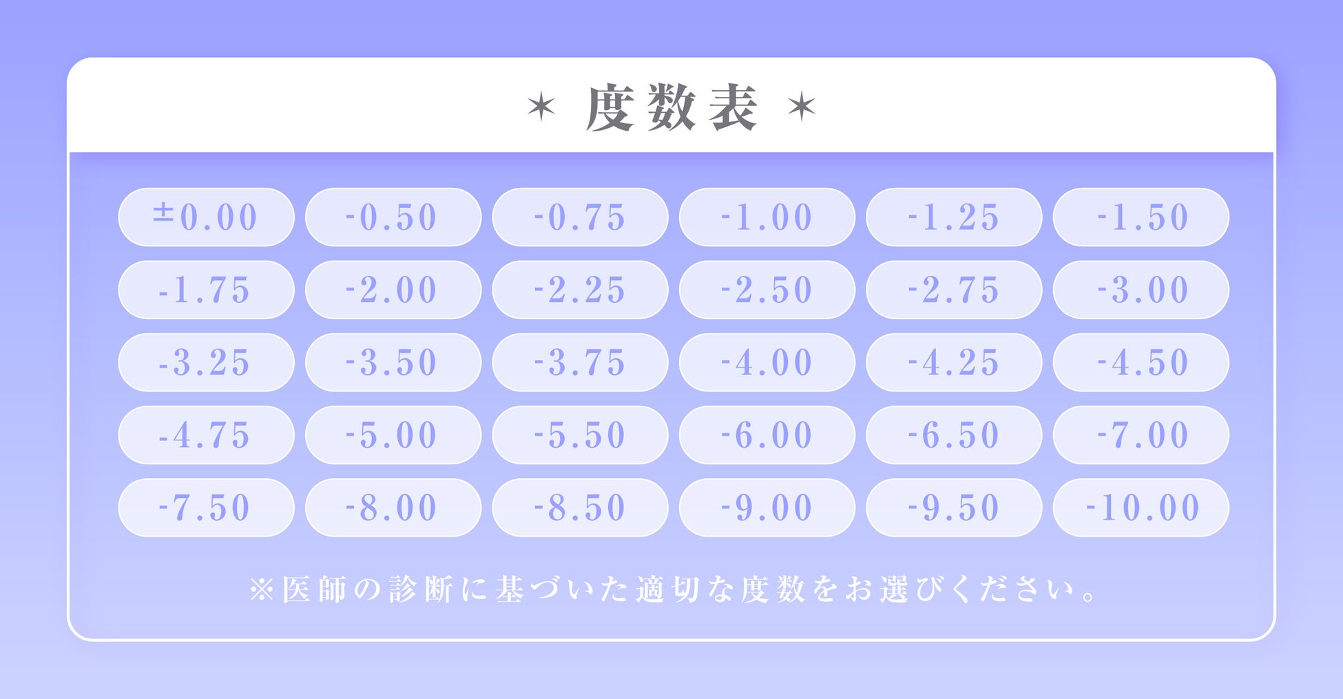 ±0.00(度なし)から-10.00まで、豊富な度数展開もご用意しておりますので、幅広い度数の方にお使いいただけます。