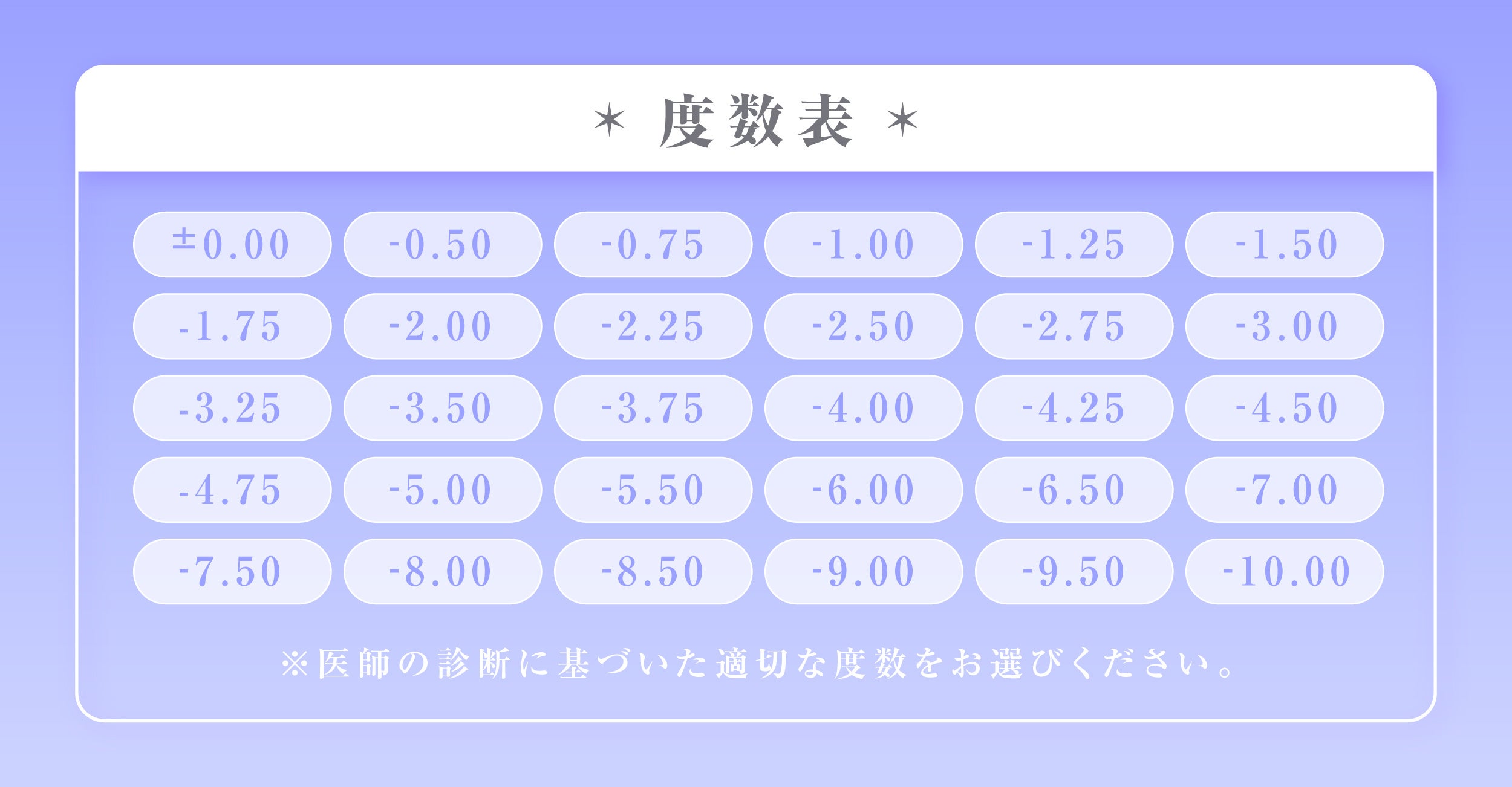 ±0.00(度なし)から-10.00まで、豊富な度数展開もご用意しておりますので、幅広い度数の方にお使いいただけます。