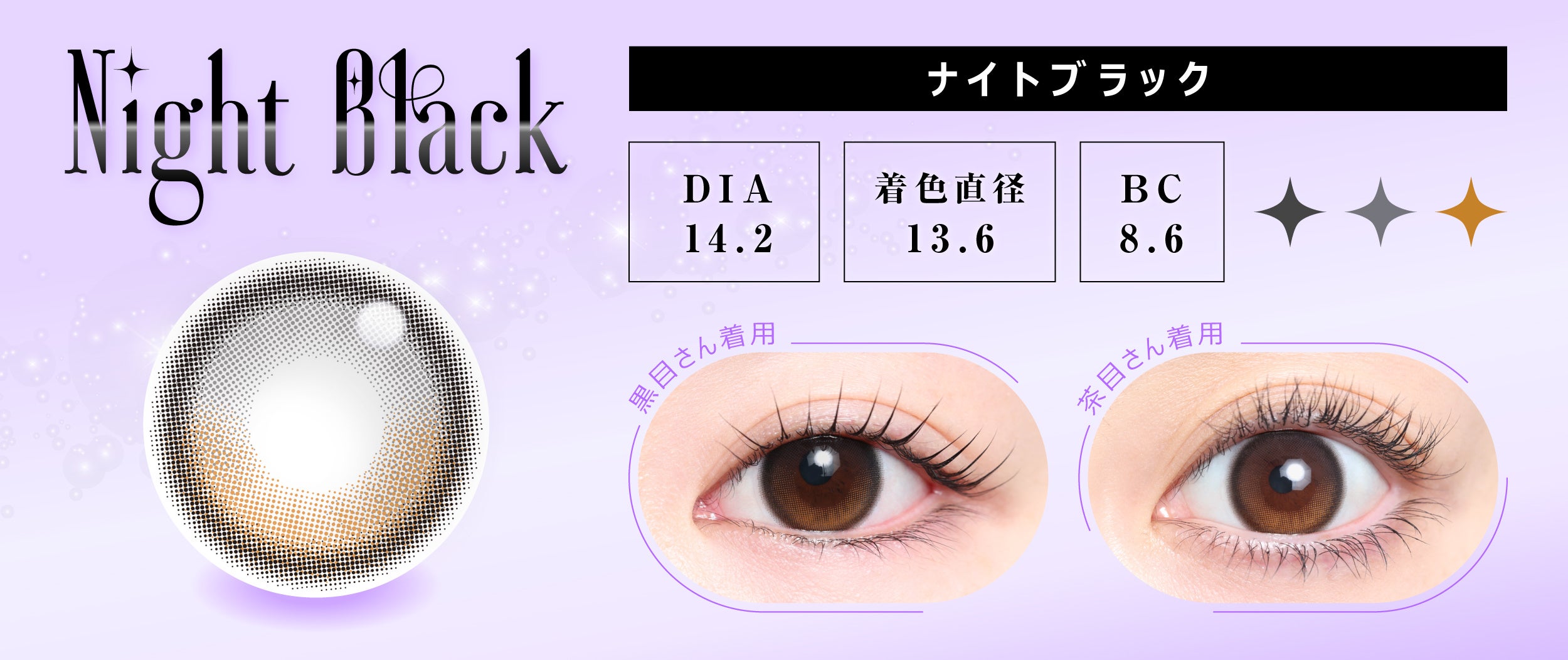 今回発売するのは「Night Black(ナイトブラック)」と「Night Gray(ナイトグレー)」の2色。いずれも回らない水光カラコンとなっているためハイライトが可愛く見える位置でキープされ、うるっとした瞳を演出します。また、着色直径13.6mmの使いやすいサイズで、水光レンズ初心者さんにもおすすめのデザインとなっております。